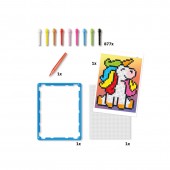 Setul permite copiilor sa creeze un mozaic digital cu tema unui unicorn, utilizand pixeli colorati pe o tabla. Fiecare pixel se potriveste intr-un loc specific pe tabla, iar copiii trebuie sa aleaga culoarea corespunzatoare pentru a completa imaginea.