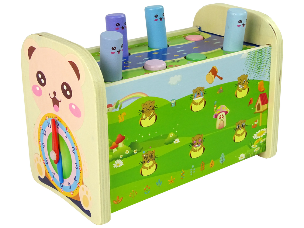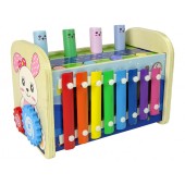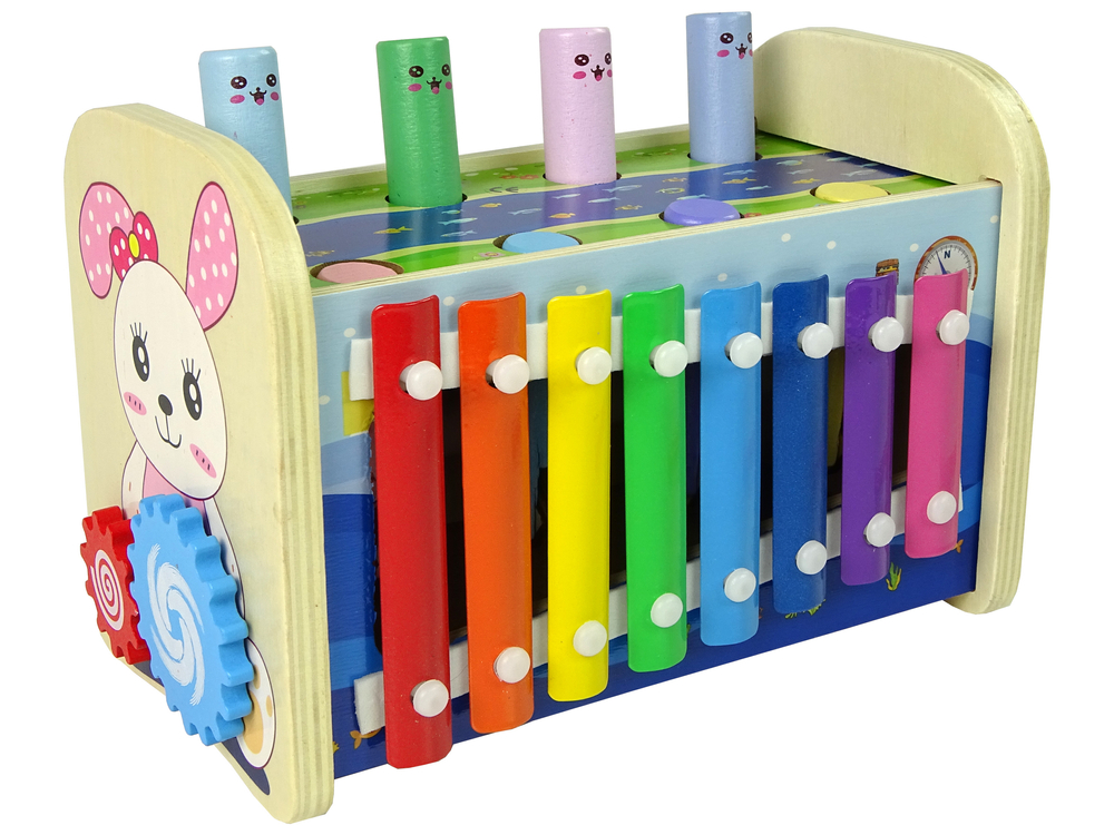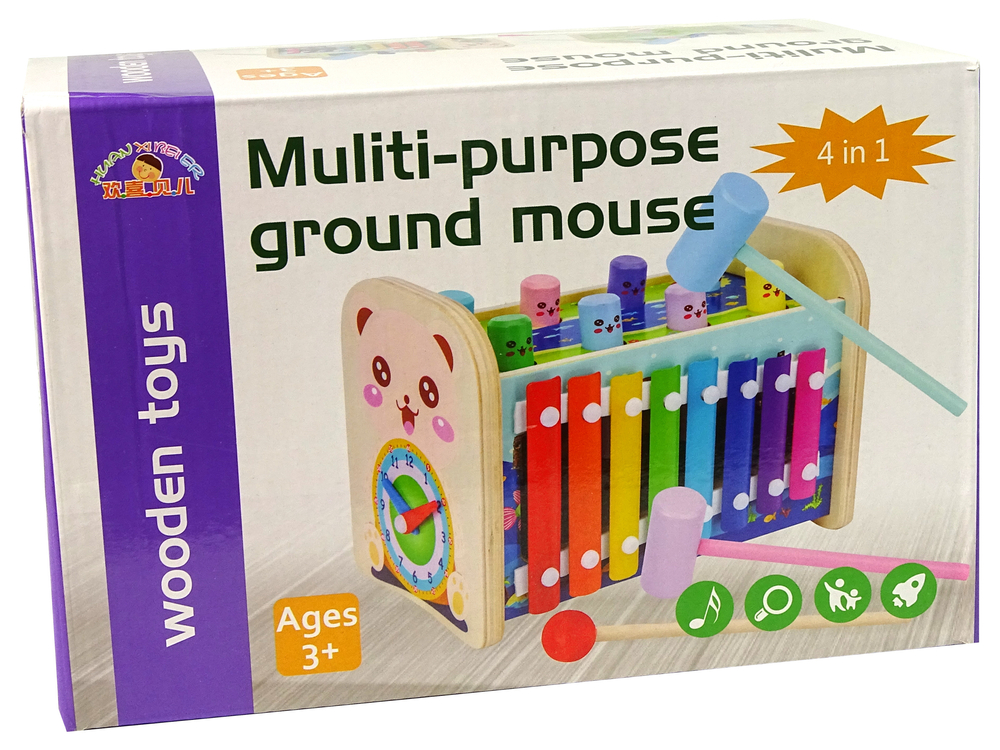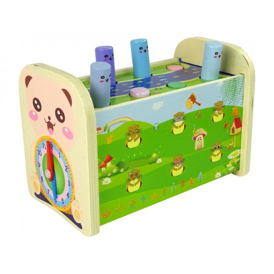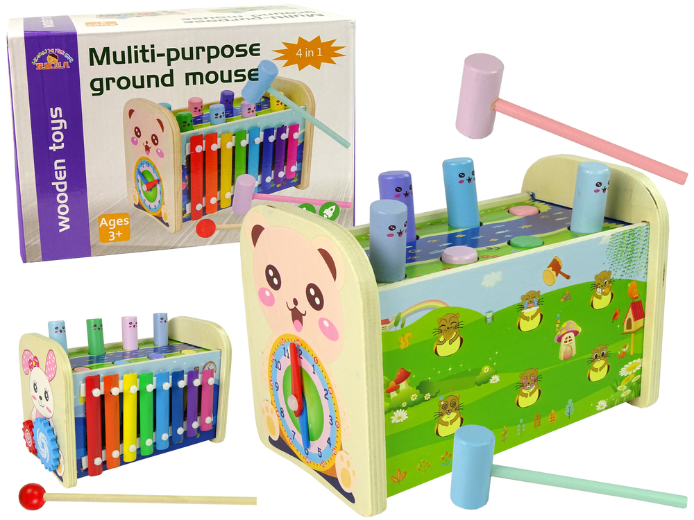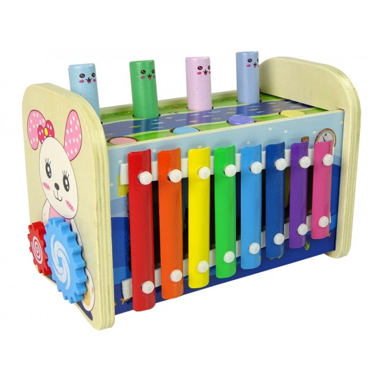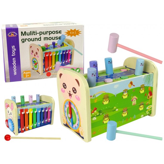 Jucarie din lemn 4 in 1 cu xilofon, ciocan si ceas