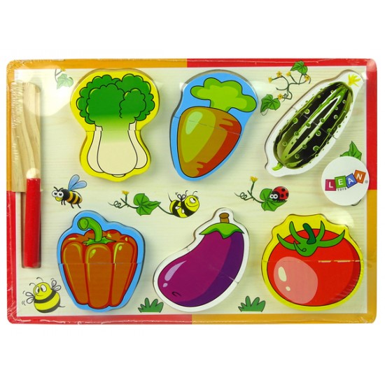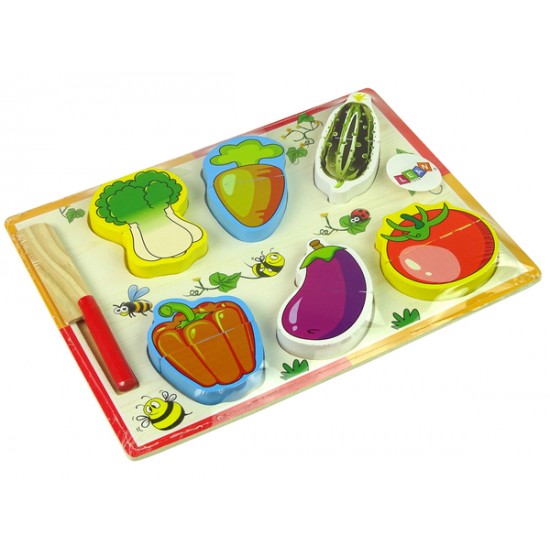 Cutitasul din lemn este pregatit pentru a taia legumele in jumatati, astfel setul va deveni un excelent puzzle de dezvoltare pentru copilasi.