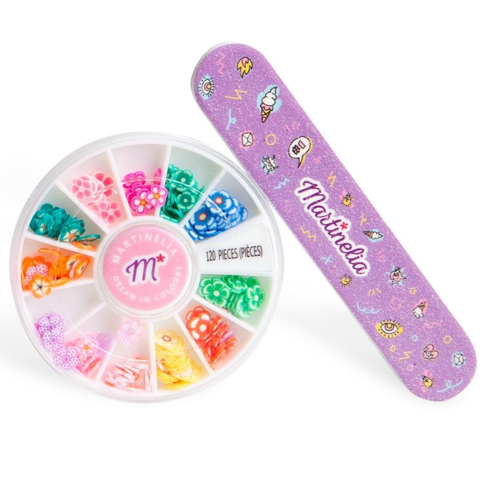 Include trei lacuri de unghii colorate, decoratiuni in culori si forme asortate, o pila de unghii.
