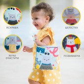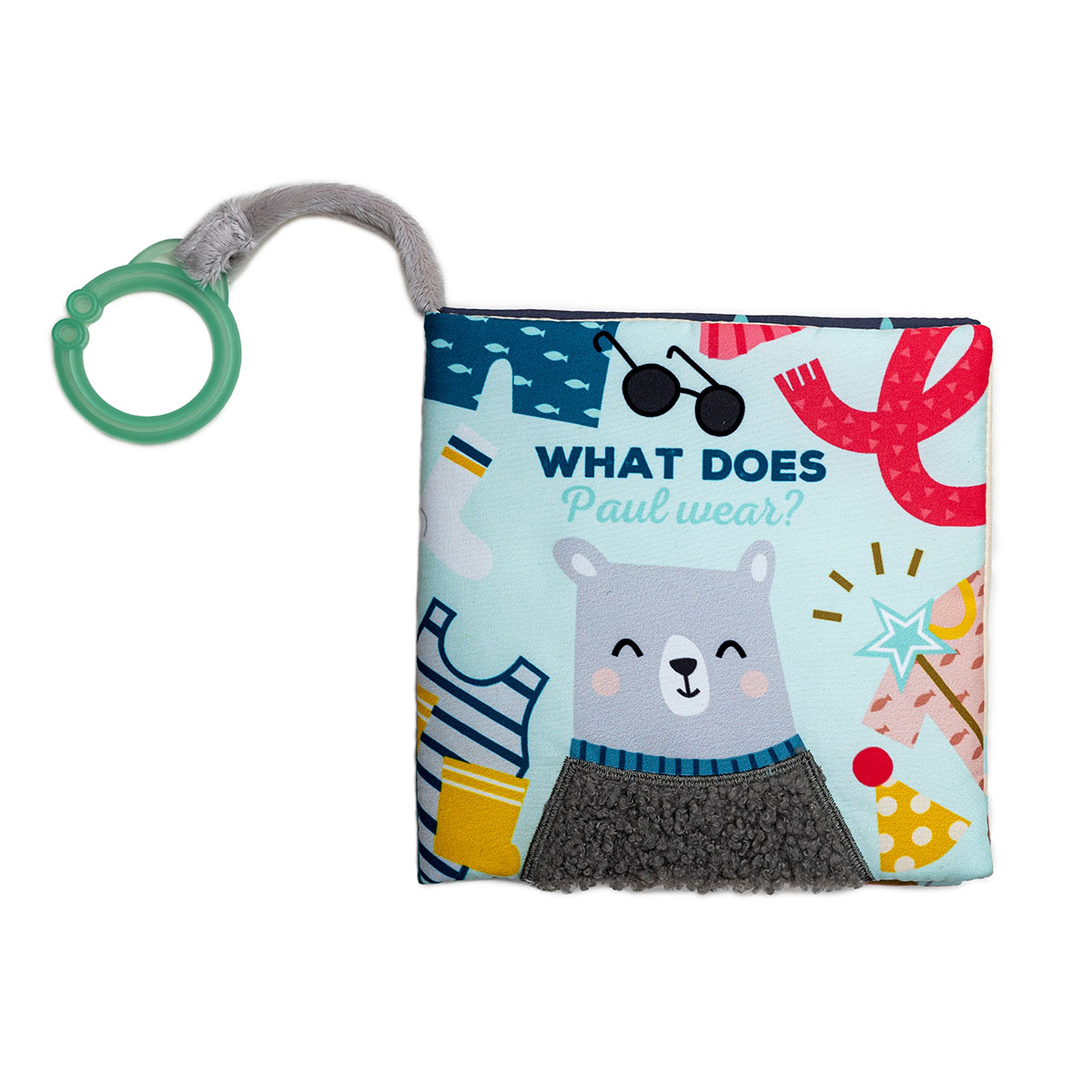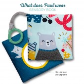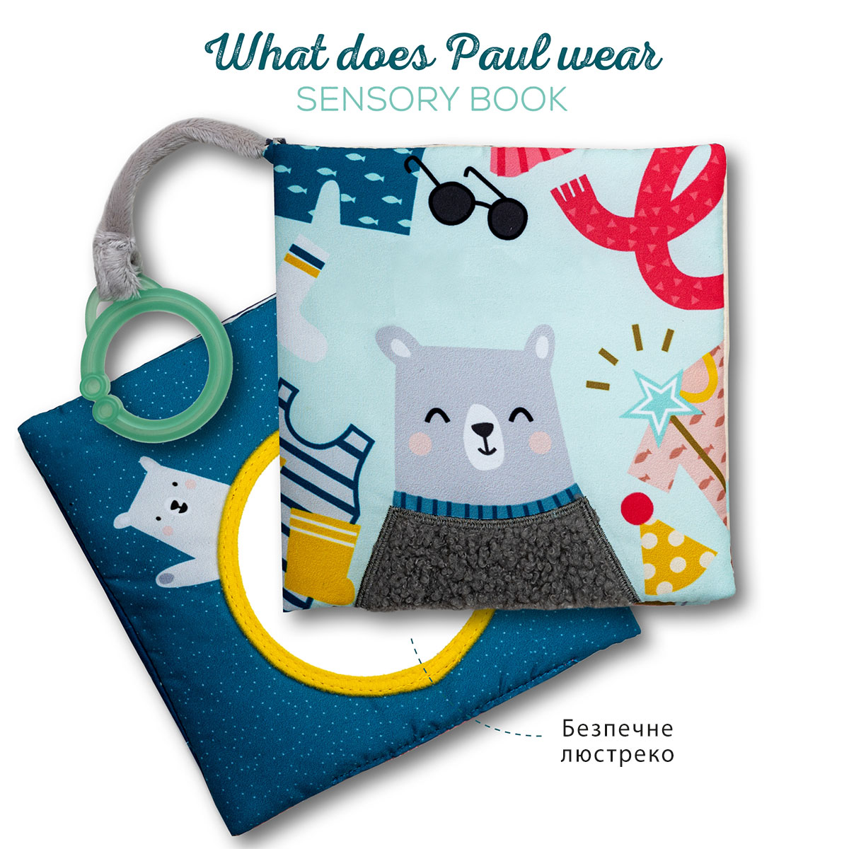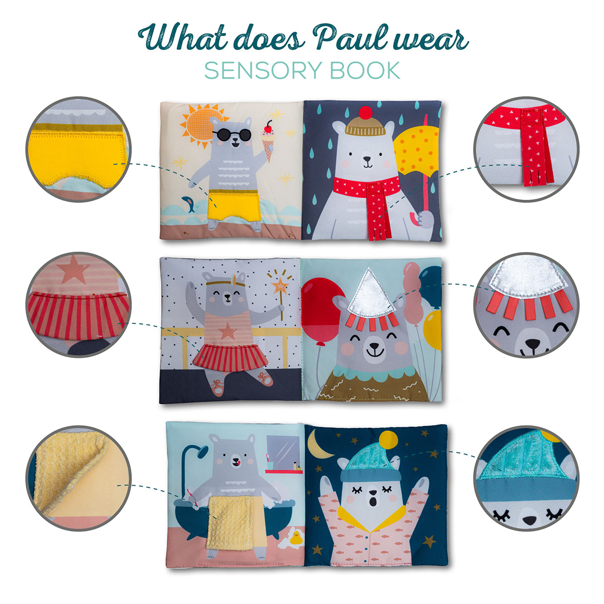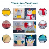 Cartea senzoriala in curs de dezvoltare pentru carucior colectia „Lumini polare” - CE IMBRACA URSUL PAUL - acestea sunt 8 „pagini” moi, cu desene si elemente de dezvoltare.