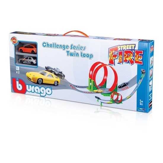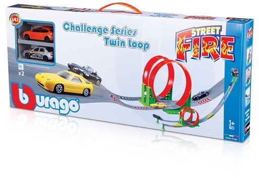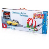 Un set minunat de joc de la Bburago, contine doua piste, care la capatul traseului sunt rasucite in bucle. In set sunt doua masini (scara 1:43). Cu ajutorul mecanismului de declansare, masinile intra intr-o cursa interesanta, depasind obstacolele si sarind pe o rampa de lansare. Organizati competitii cu prietenii si recompensati cistigatorii cu o alta cursa de mare viteza!