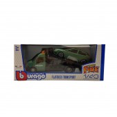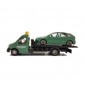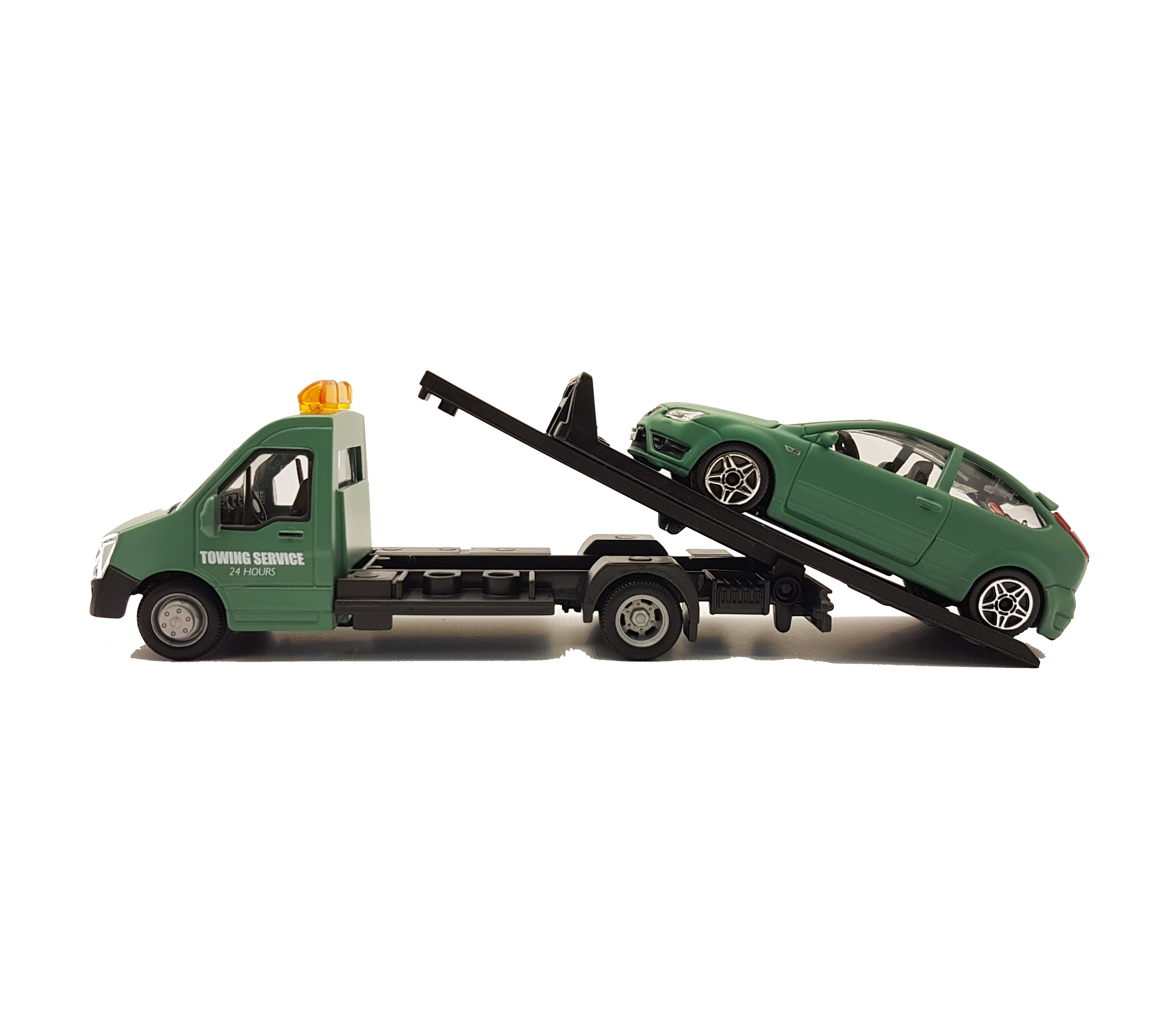 Transportorul auto verde este echipat cu o platforma mobila pentru ridicarea rapida a masinii.