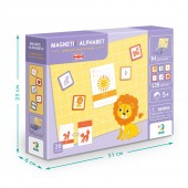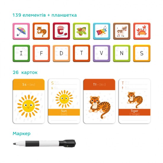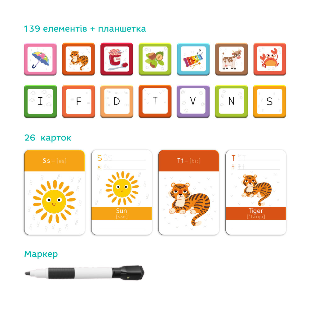 Studiem engleza cu magneti stralucitori. Jocul educativ include o tableta magnetica, un suport pentru ea, carduri pentru invatare, elemente magnetice cu litere si imagini. Pe fiecare card exista o litera, un cuvant si un loc pentru invatarea scrisului. Acesta este un dublu beneficiu - copilul invata atat literele alfabetului, cat si cuvintele noi.