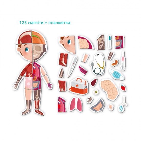 E timpul sa afli mai multe despre corpul uman! Studiem structura scheletului, numele organelor interne si muschilor cu un joc magnetic.