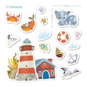 Setul contine 17 elemente magnetice, inclusiv personajul nostru principal - un sigiliu marinar, un far si diverse creaturi marine.
