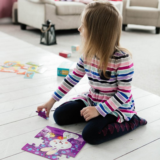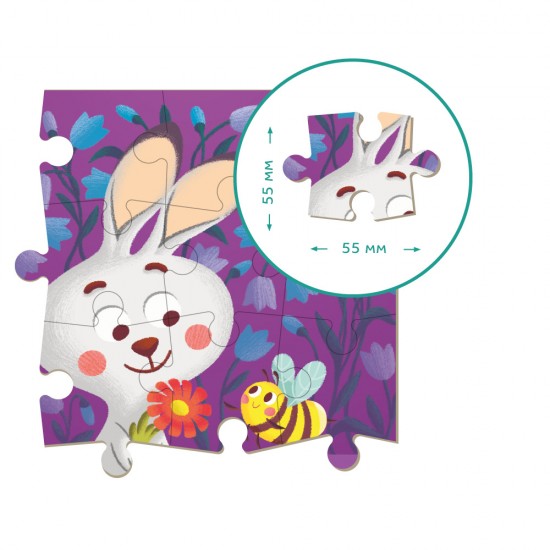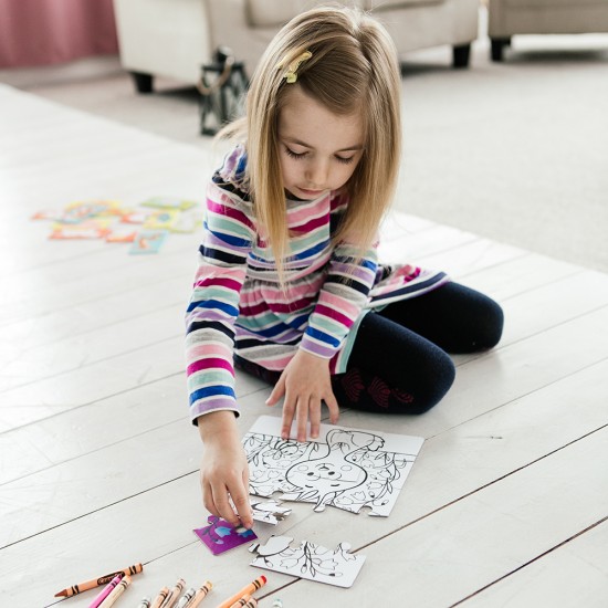 Puzzle-urile 2 in 1 combina doua distractii preferate: mai intai, copiii vor trebui sa alcatuiasca un puzzle, apoi sa picteze o imagine alb-negru pe partea opusa. Imaginile pitoresti capteaza atentia copilului, iar datorita detaliilor mari si cartonului gros, puzzle-ul va rezista oricarui joc. Ajuta copiii sa-si dezvolte abilitatile motorii fine, coordonarea si gandirea spatiala.