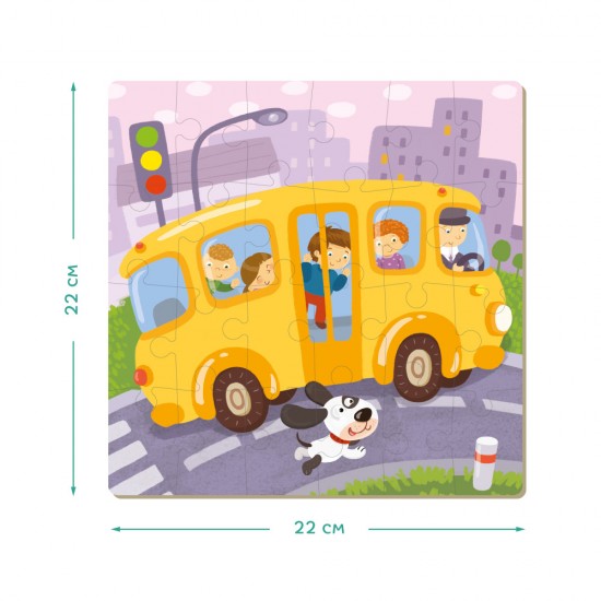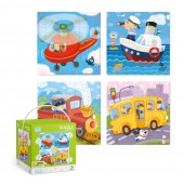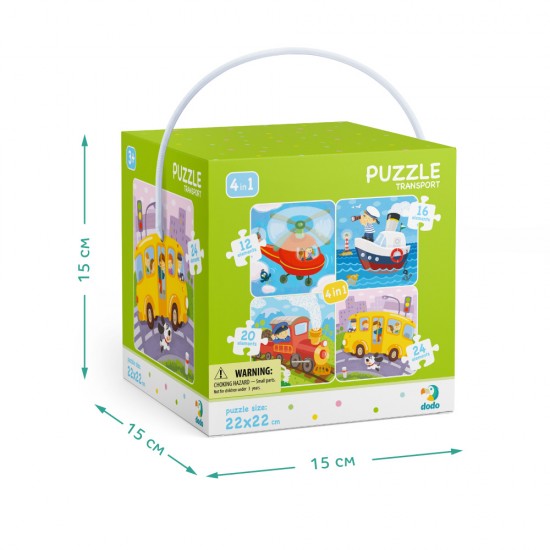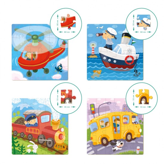 Cum difera un helicopter de o nava cu motor? Cine calatoreste pe pamant si cine are nevoie de sine? Sa invatam cuvinte noi si sa aflam mai multe despre transport impreuna cu puzzle-ul 4 in 1. Exista 4 nivele de dificultate intr-un singur set: puzzle-uri cu 12, 16, 20 si 24 de elemente, astfel incat jocul poate deveni mai dificil in timp. Acest joc il ajuta pe copil sa-si dezvolte abilitatile motorii fine, coordonarea si gandirea spatiala.