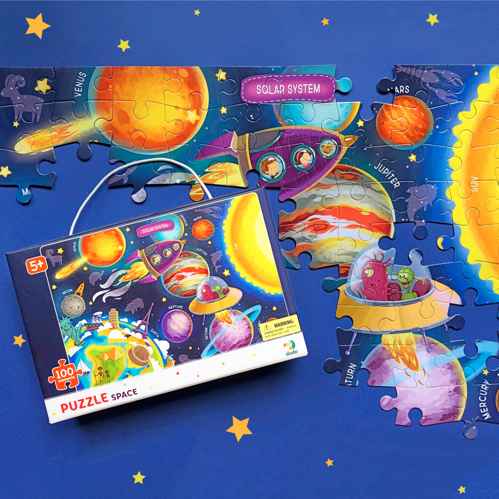 Explorati toate curiozitatile spatiului cu ajutorul acestui puzzle - comete si stele, asteroizi si... extraterestri? In ce alte aventuri vor intra personajele in timp ce exploreaza planetele? Puzzle-ul este realizat din carton gros, luminos si usor de jucat. Cadoul perfect pentru micii exploratori si calatori.