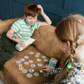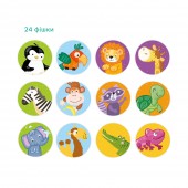 Jocul Mini Memo "Animale salbatice" este format din carti rotunde din carton laminat.