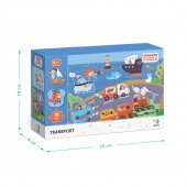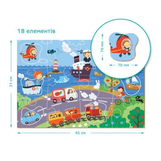 Pe acest puzzle, toata lumea se grabeste, navigheaza pe barci si nave, merg in trenuri si masini, chiar si animalele sunt grabite undeva. O combinatie interesanta pentru a juca cu puzzle-uri de sortare, mai intai, copiii trebuie sa asambleze un puzzle clasic si apoi sa introduca elementele lipsa ale sortatorului in locurile lor. Jocul dezvolta abilitatile motorii fine, coordonarea vizual-motorie si strategia de rezolvare a problemelor.