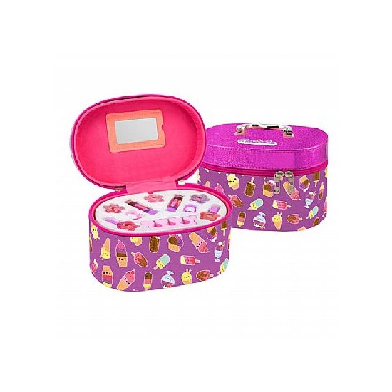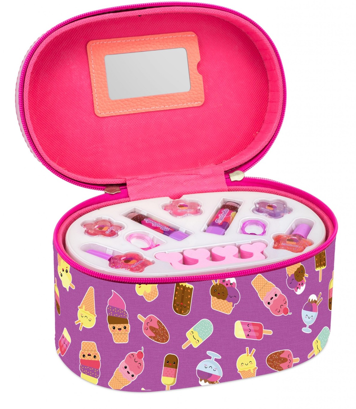 Distreaza-te si simte-te speciala cu minunatul set pentru copii Yummy Beauty Bag, uimitoarea valiza care include 2 lacuri de unghii solubile in apa, 3 luciu de buze, 2 luciuri de de buze, 2 inele, 1 separator de degete si perii.