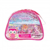 Setul contine: o paleta cu 8 farduri de ochi culori pastelate; 1 ruj; 2 accesorii pentru par; 2 oje; 2 luciuri de buze; o geanta cosmetica cu paiete.