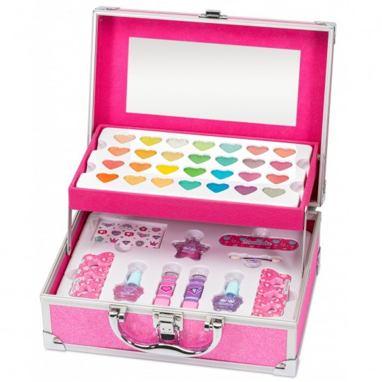 Toate acestea sunt aranjate frumos intr-o valiza pe care fetita o poate lua oricand cu ea, astfel fiind mereu pregatita sa se machieze frumos. Setul contribuie la dezvoltarea creativitatii si laturilor artistice ale copilului, asigurand o crestere sanatoasa, inteligenta si sigura.