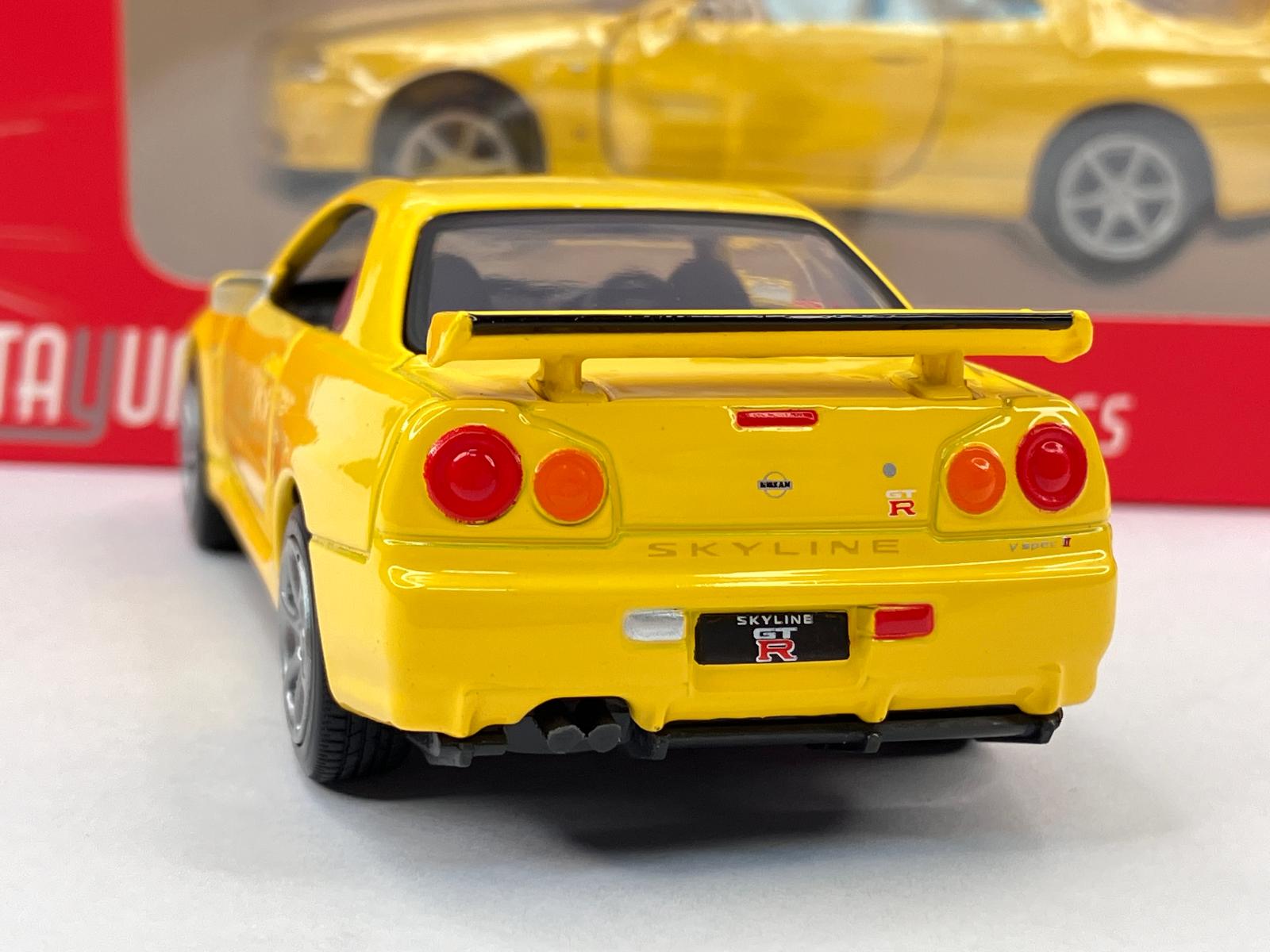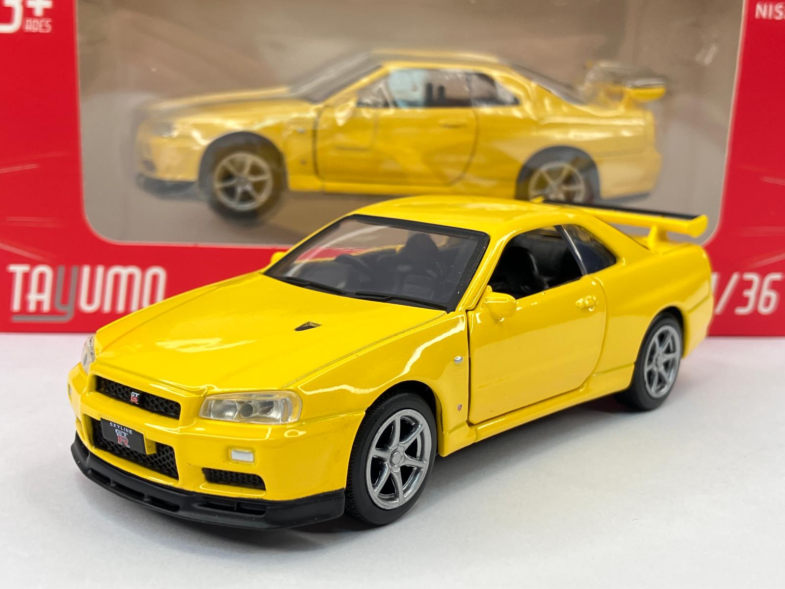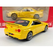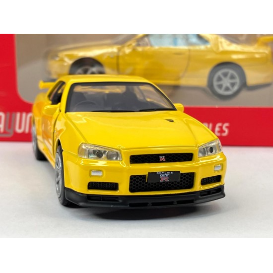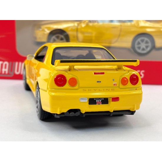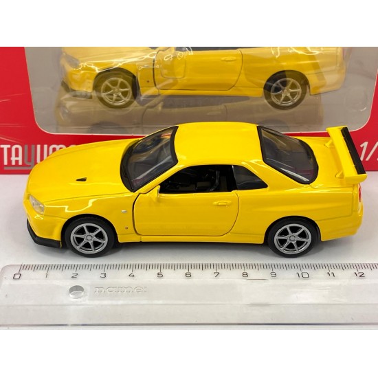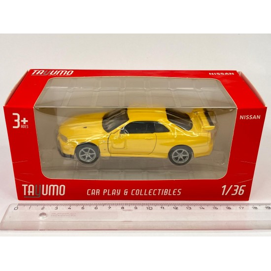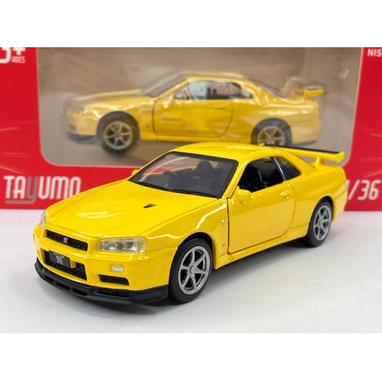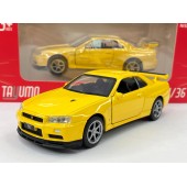 Macheta auto Nissan GT-R34 V-Spec II, galben, 1:36, mecanism pull-back, RHD, TAYUMO
