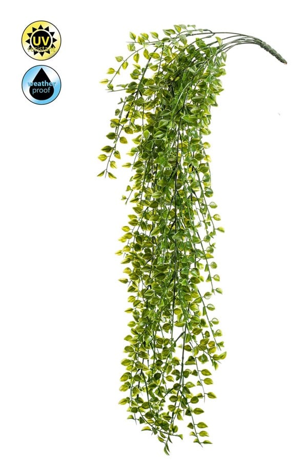 Tufa suspendata de Ficus pumila artificial, de 80 cm, aduce un efect de verdeata abundenta si eleganta. Fabricata din mase plastice rezistente UV, este ideala pentru pereti verzi sau decor urban.