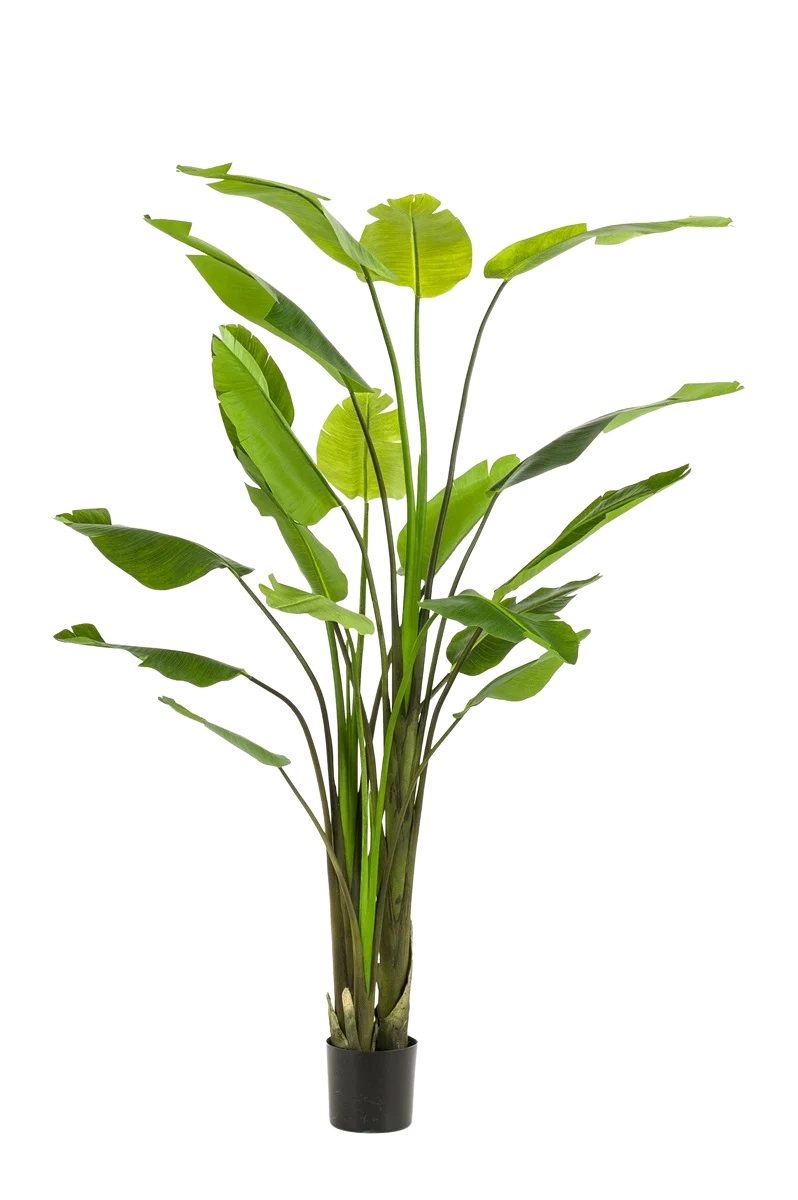 Strelitzia Nicolai artificiala, cu 18 frunze si o inaltime de 235cm, este ideala pentru decoruri grandioase. Confectionata din mase plastice, ofera un aspect exotic si elegant, potrivit pentru spatii comerciale sau holuri mari.