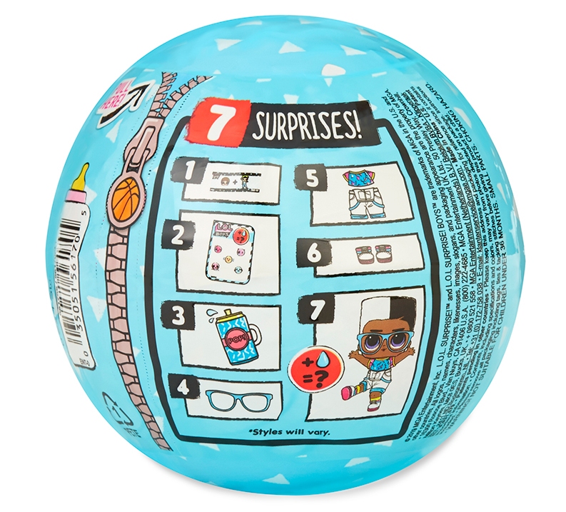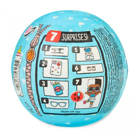 Pachetul contine 7 surprize: Papusa LOL Surprise Boys, autocolante, mesaj secret, sticla, tinuta, accesorii si pantofi.