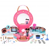 Veti avea parte de 50 de surprize la despachetare. Deschideti gentuta si ea se va transforma intr-un adevarat salon de frumusete. Setul include o oglinda iluminata, podium, garderoba si o multime de zoane pentru joaca.