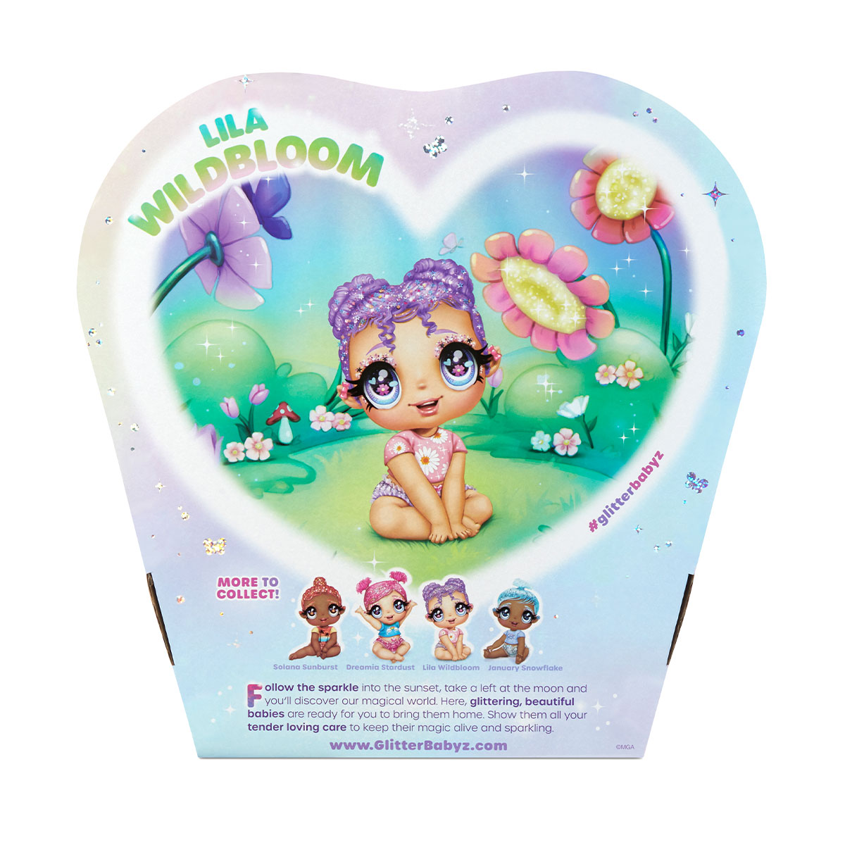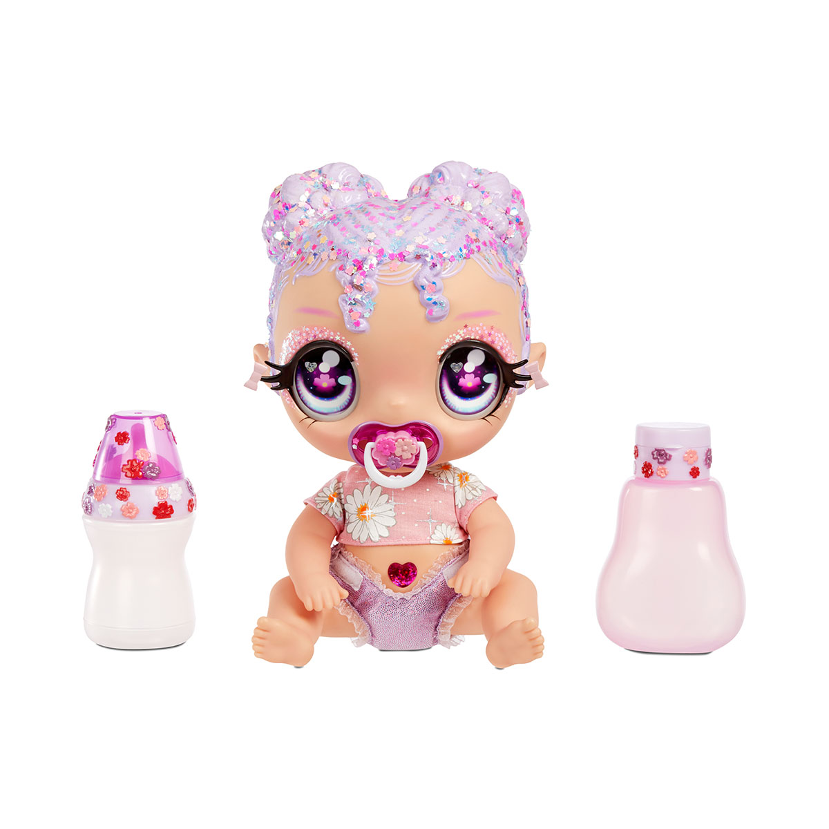 Sclipitoare si adorabile, unice si incantatoare, noile papusi bebelusi Glitter Babyz se nasc pe un taram magic, luminos si stralucitor. Fiecare papusa are un nume original, haine stilate si par sclipitor, ele beau din sticluta si fac pipi. Dar cel mai important este ca parul lor, sticluta pentru suc si sticluta pentru sampon isi schimba culoarea in apa rece. Bratele si picioarele lor sunt mobile iar in pozitie asezata papusa are o inaltime de 20 cm.
