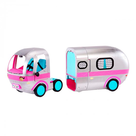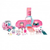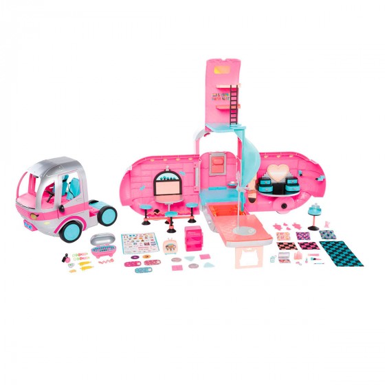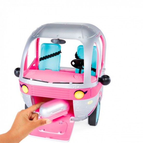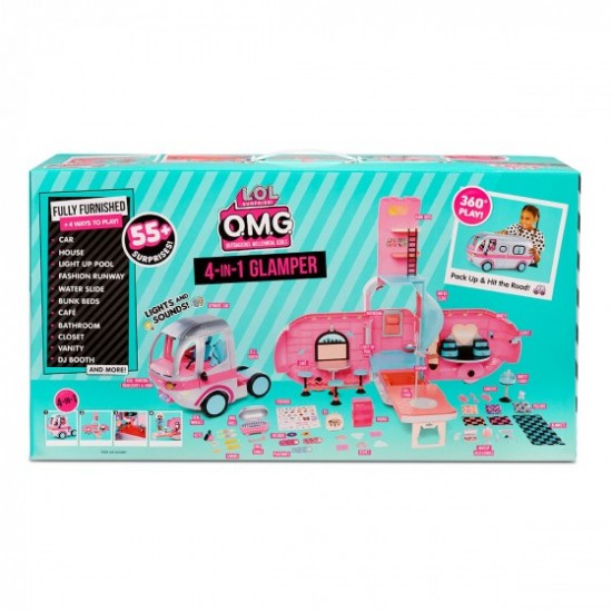 Camper 4-in-1: masina, cabina, podium de moda si piscina. Exista peste 55 de surprize de despachetat si peste 10 zone de joc in interior. Setul este potrivit pentru papusi de moda O.M.G. si papusi L.O.L. SURPRISE!