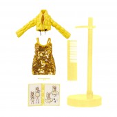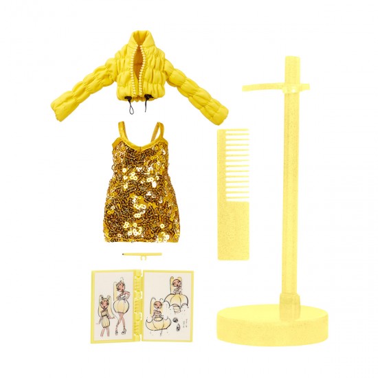 Setul include papusa Sunny Madison cu o rochie de gala eleganta galbena, acum poate straluci la toate evenimente speciale si petreceri. In plus, papusa are si o a doua tinuta casual, o rochie galbena cu paiete adorabile si o jacheta pufoasa. Ca bonus, vei gasi si o carte cu schite, care poate fi folosita pentru a-ti inspira creativitatea in ceea ce priveste moda si designul vestimentar.