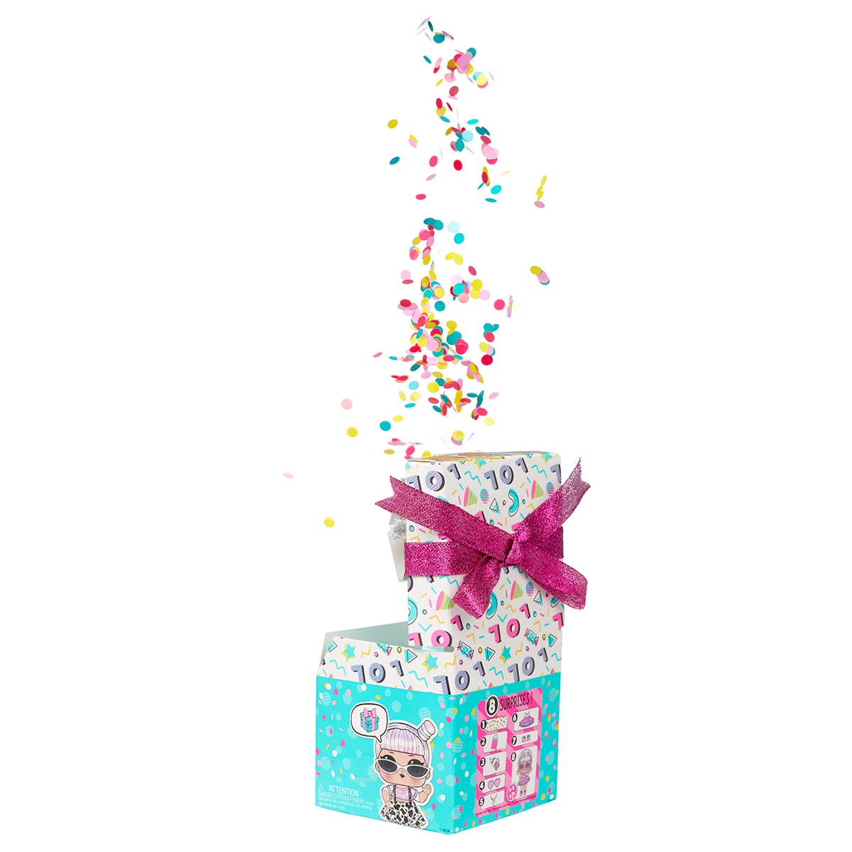 Intr-o cutie de cadou Confetti Pop vei gasi 8 surprize: