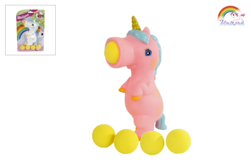 Unicornul Popper magnific apare langa tine! Unicornul roz impusca bile de spuma moale de culoarea galbena. Doar strangeti burta Unicornului pentru a impusca bila.