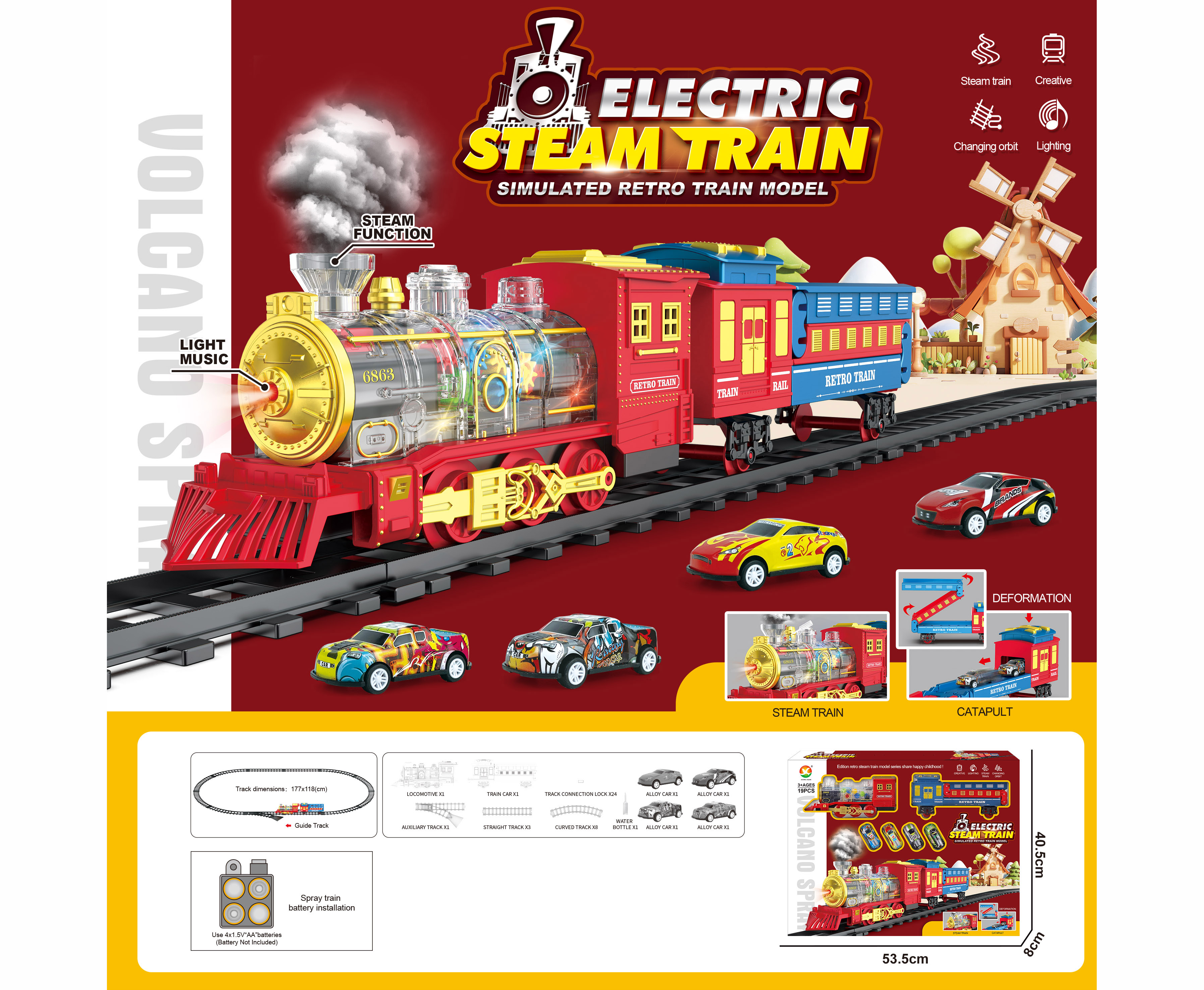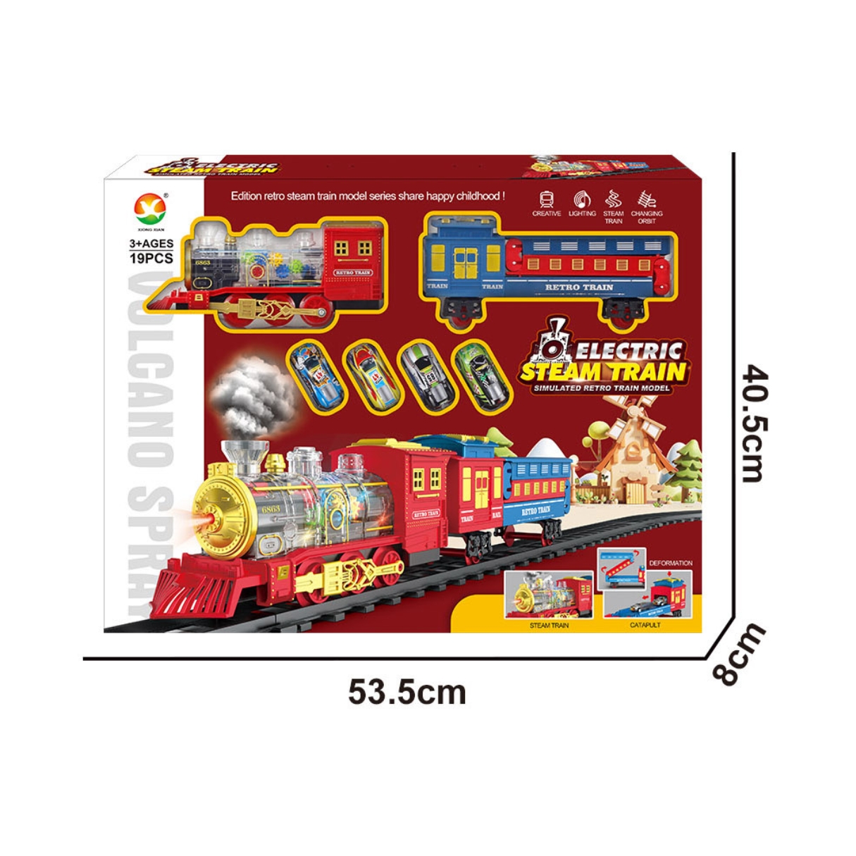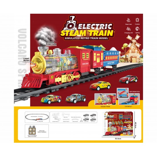 Set Tren cu cale ferata, sunete, lumini, efect fum, 1 vagon, 4 masini si lansator,