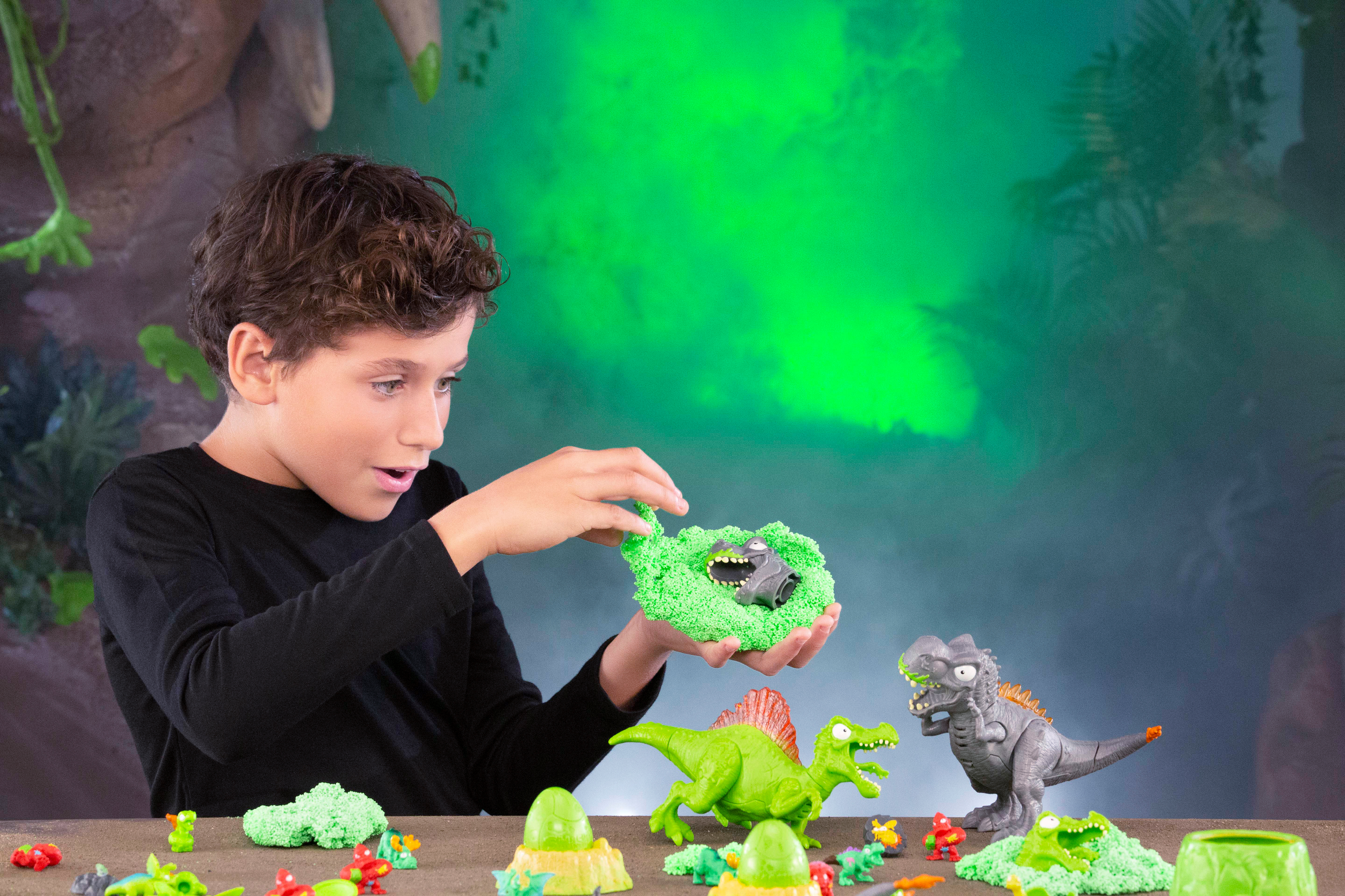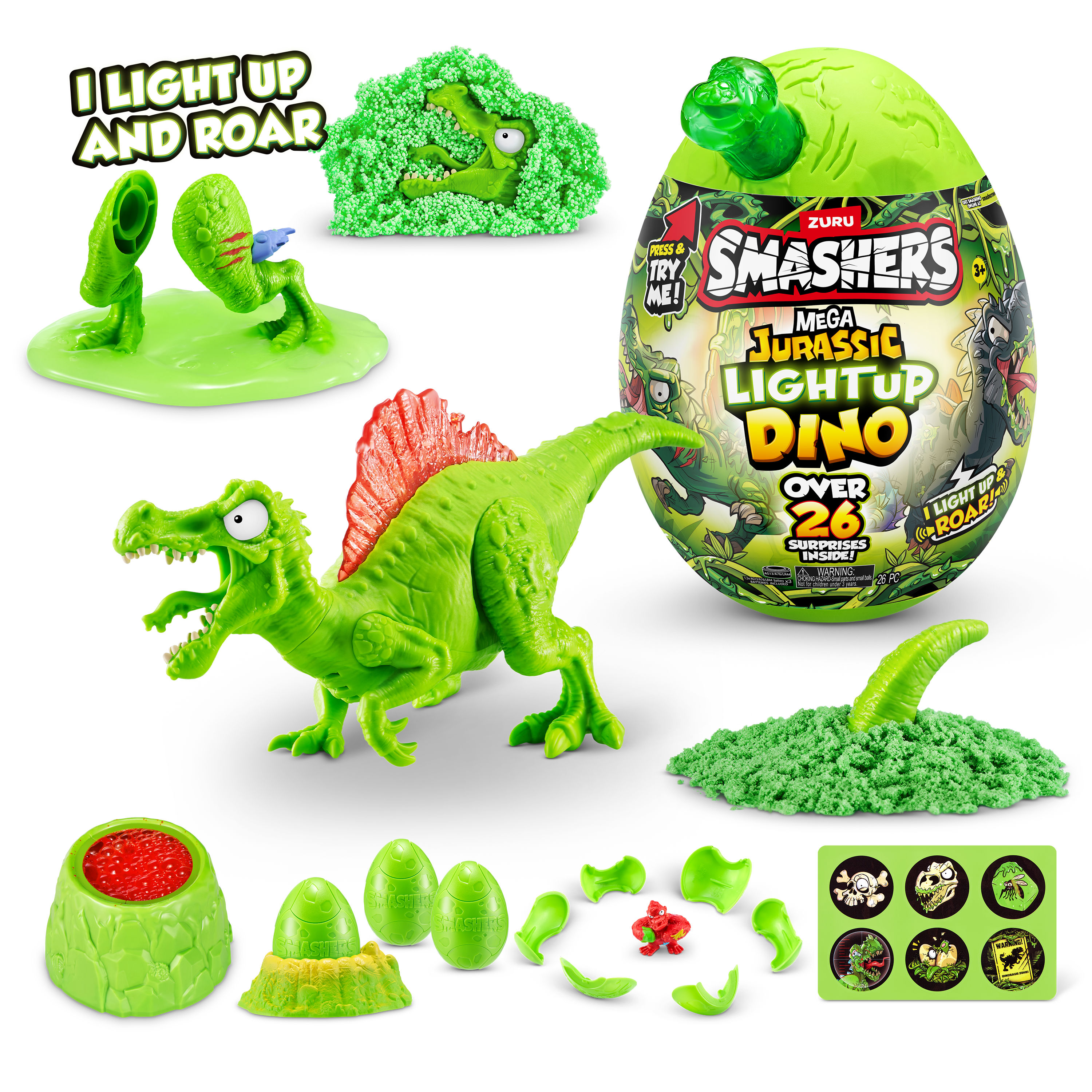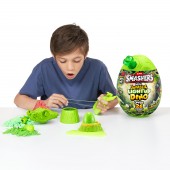 Pregateste-te sa spargi, sa gazduiesti si sa iti faci drum prin peste 26 de surprize Smashers. Zdrobeste oul si sapa prin nisip si slime care isi schimba culoarea pentru a va descoperi piesele de dino. Construieste-ti dino-ul pentru a-l vedea cum lumineaza si rabufneste. Vei gasi surprize epice, precum slime, nisip, vulcani care sclipesc, spuma, autocolante, oua zdrobite si multe altele!