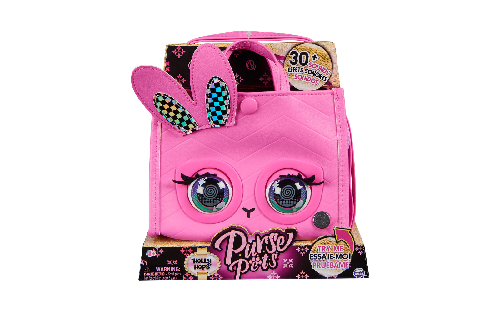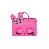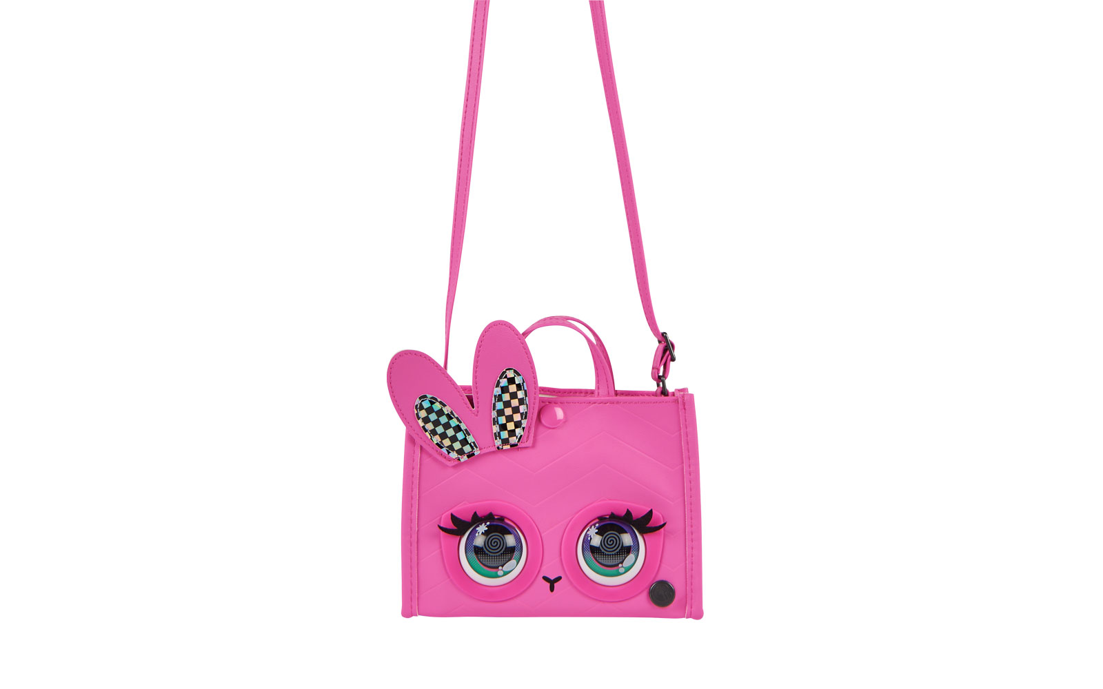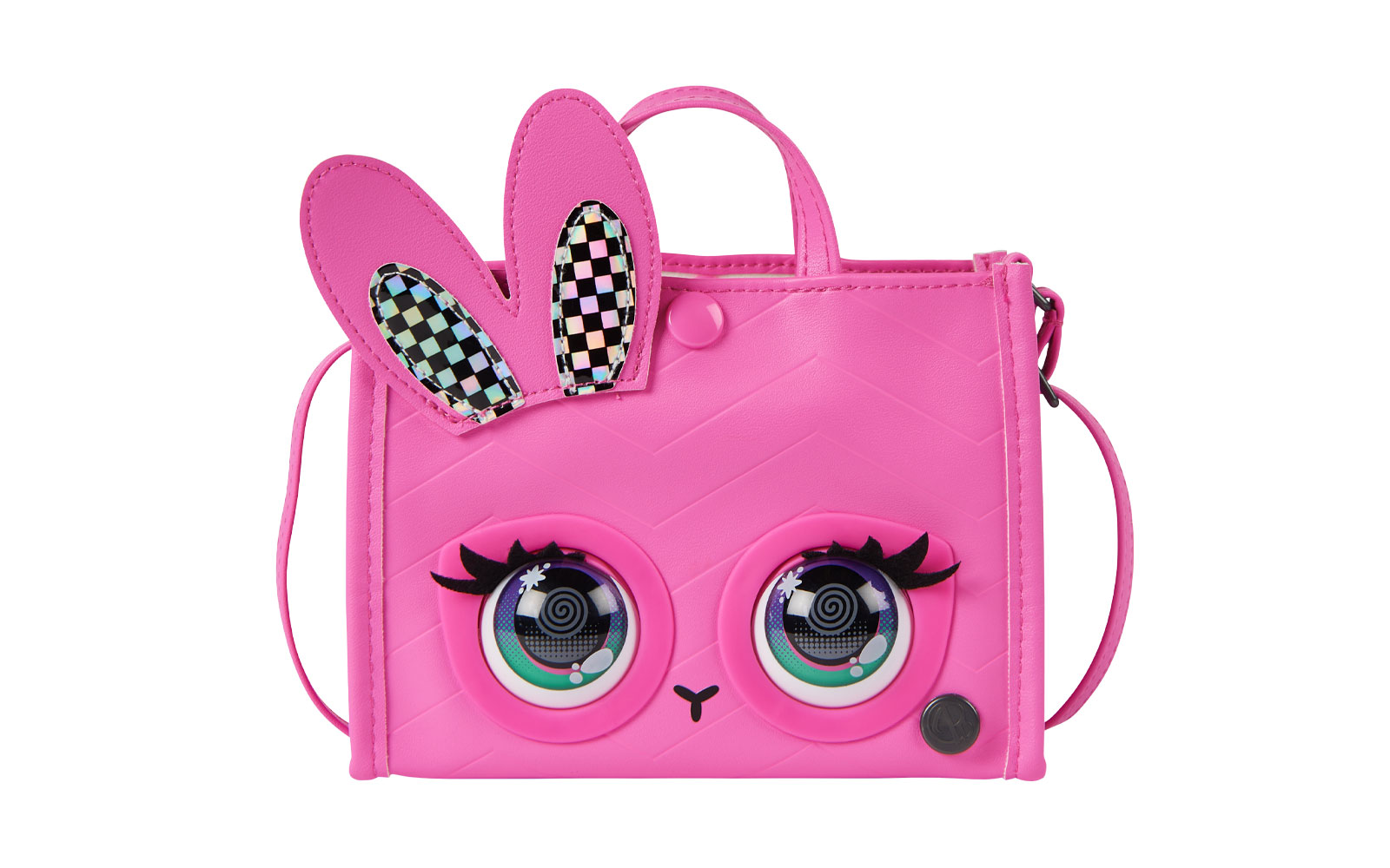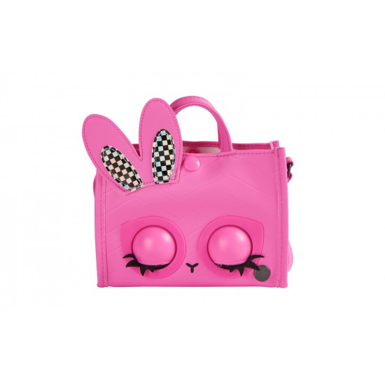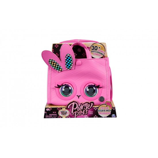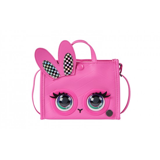 Da viata aspectului tau cu poseta pentru fete Purse Pets. Aceasta geanta este pline de personalitate. Reactioneaza la atingere, clipeste cu adevarat si are peste 30 de sunete si reactii. Are tesatura roz, urechi de iepuras in carouri, ochi si inchidere cu clic. Datorita curelei duble, puteti purta poseta pe brat sau puteti extinde cureaua lunga pana la 101,5 cm pentru a o purta peste umar sau peste corp. In timpul miscarii, atinge-i capul pentru a activa sunete distractive si pentru a o face sa fluture din gene. Apasa-i usor fruntea si va va arunca un sarut.