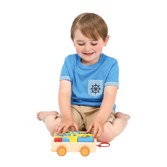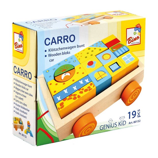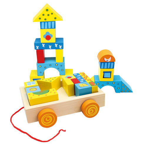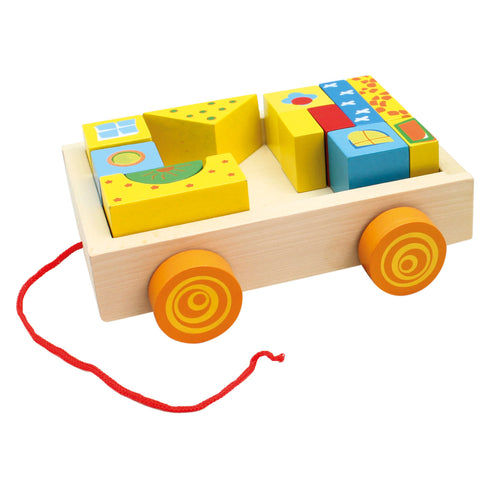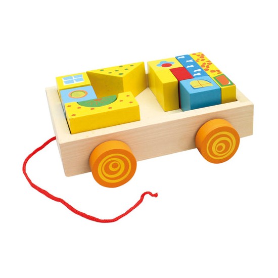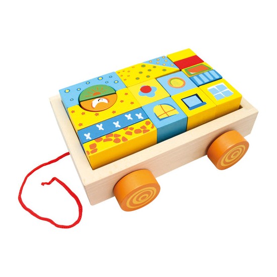 Carucior din lemn cu sfoara si cuburi de construit, 19 piese