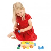 Mini-caruciorul din lemn are snurulet pentru tras, iar in interior se vor depozita toate piesele de construit din lemn.