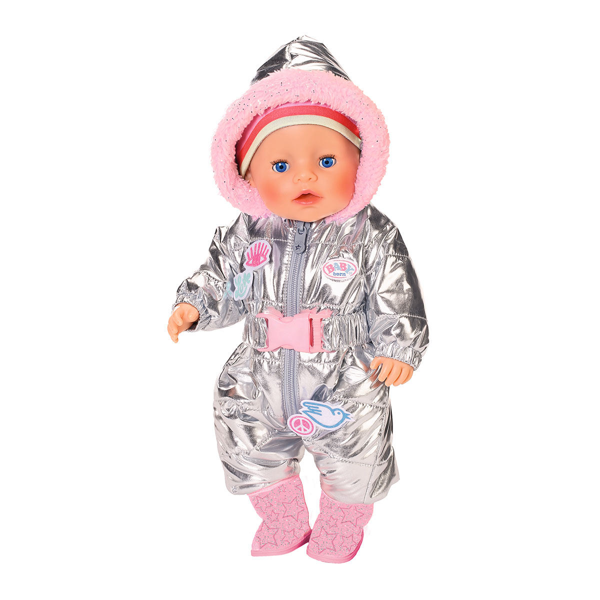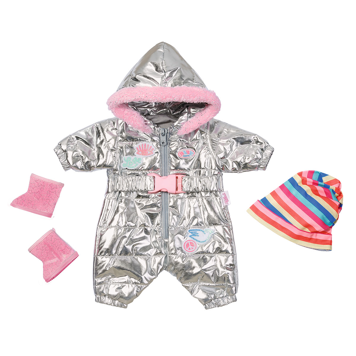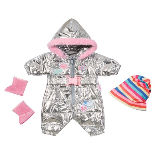 Baby Born este o adevarata fashionista care stie sa combine confortul si frumusetea intr-o maniera super eleganta. Si sunt atat de multe lucruri deosebite in garderoba ei. Priveste numai acest set original: salopeta argintie, palarie cu dungi si cizmulite roz. Papusica ta nu va ingheta de frig cu aceste hainuite calduroase si extraordinar de atractive.