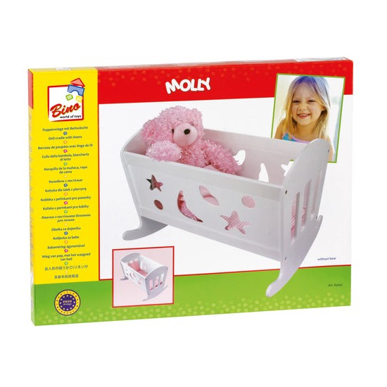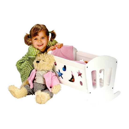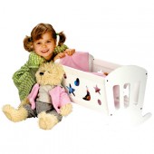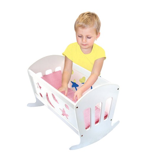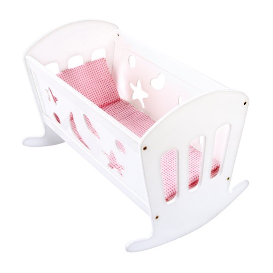 Patuc-Leagan pentru papusi din lemn, alb, cu lenjerie de pat 49x37 cm