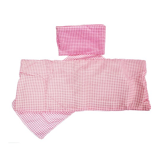 Patucul este echipat cu lenjerie de pat in culoare roz si alba.