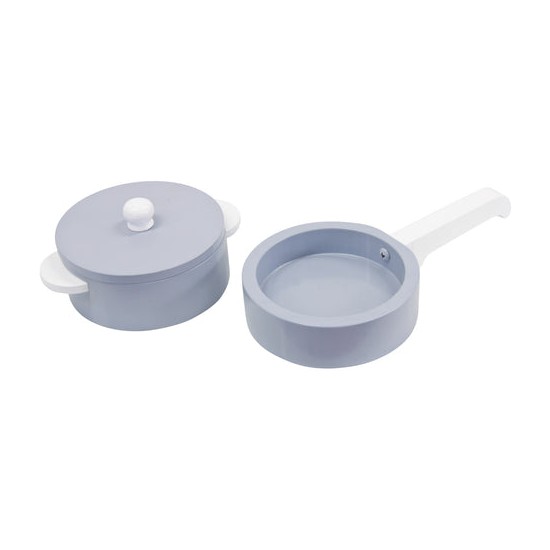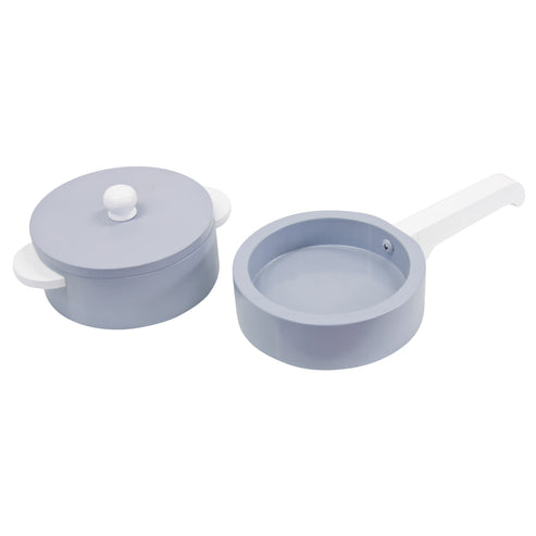 Accesorii din lemn: furculita, cutit, lingura, oala cu capac si tigaie cu capac.