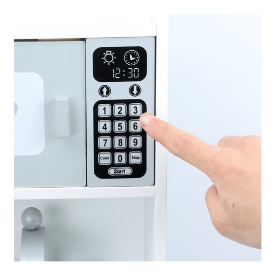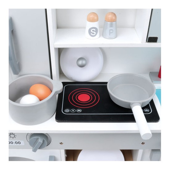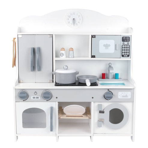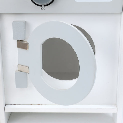 Bucatarie din lemn pentru copii cu masina de spalat, culoare alba, cu 12 accesorii, 64x69x23 cm