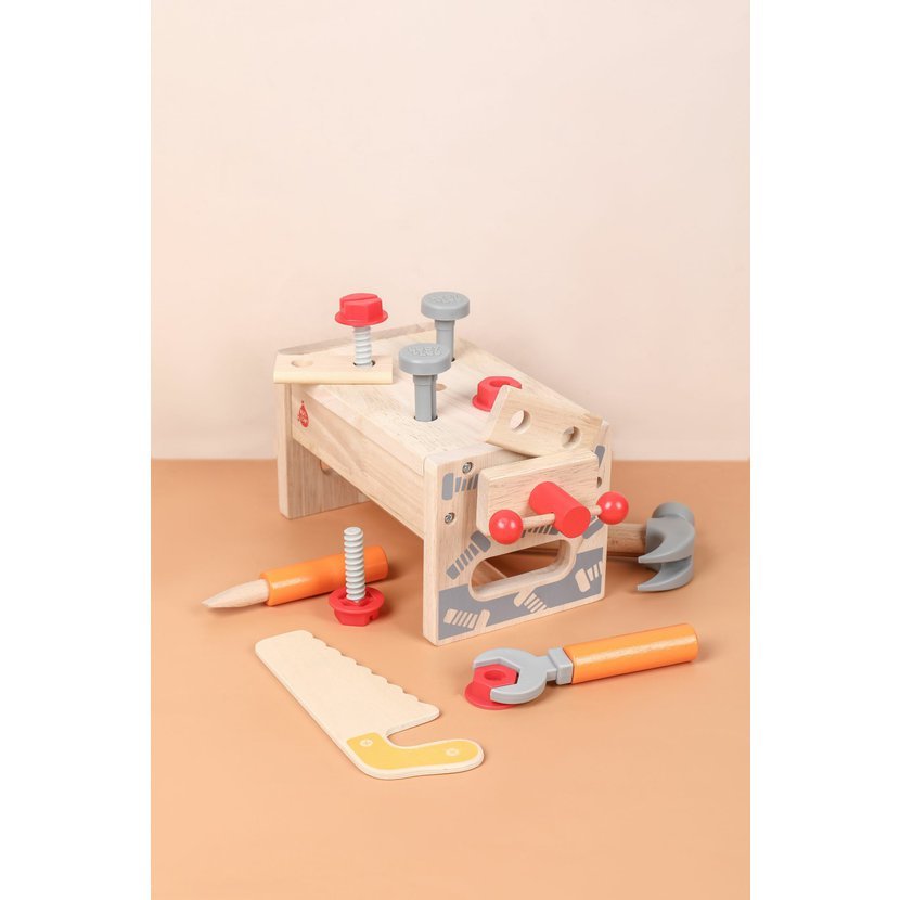 Setul este format din 15 piese si este realizat din plastic si lemn de calitate cu finisaj neted. Piesele sunt, de fapt, unelte de lucru: ciocan, ferastrau, suruburi, surubelnita, cheie, menghina, lemn neted cu gaur.