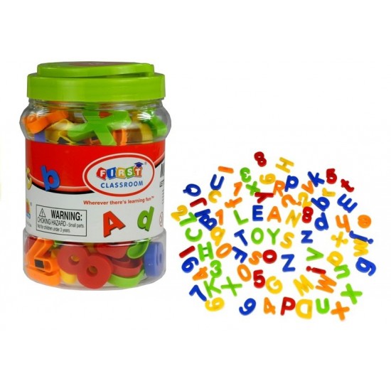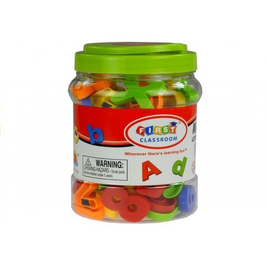Set litere si cifre magnetice multicolore in borcan 78 elemente