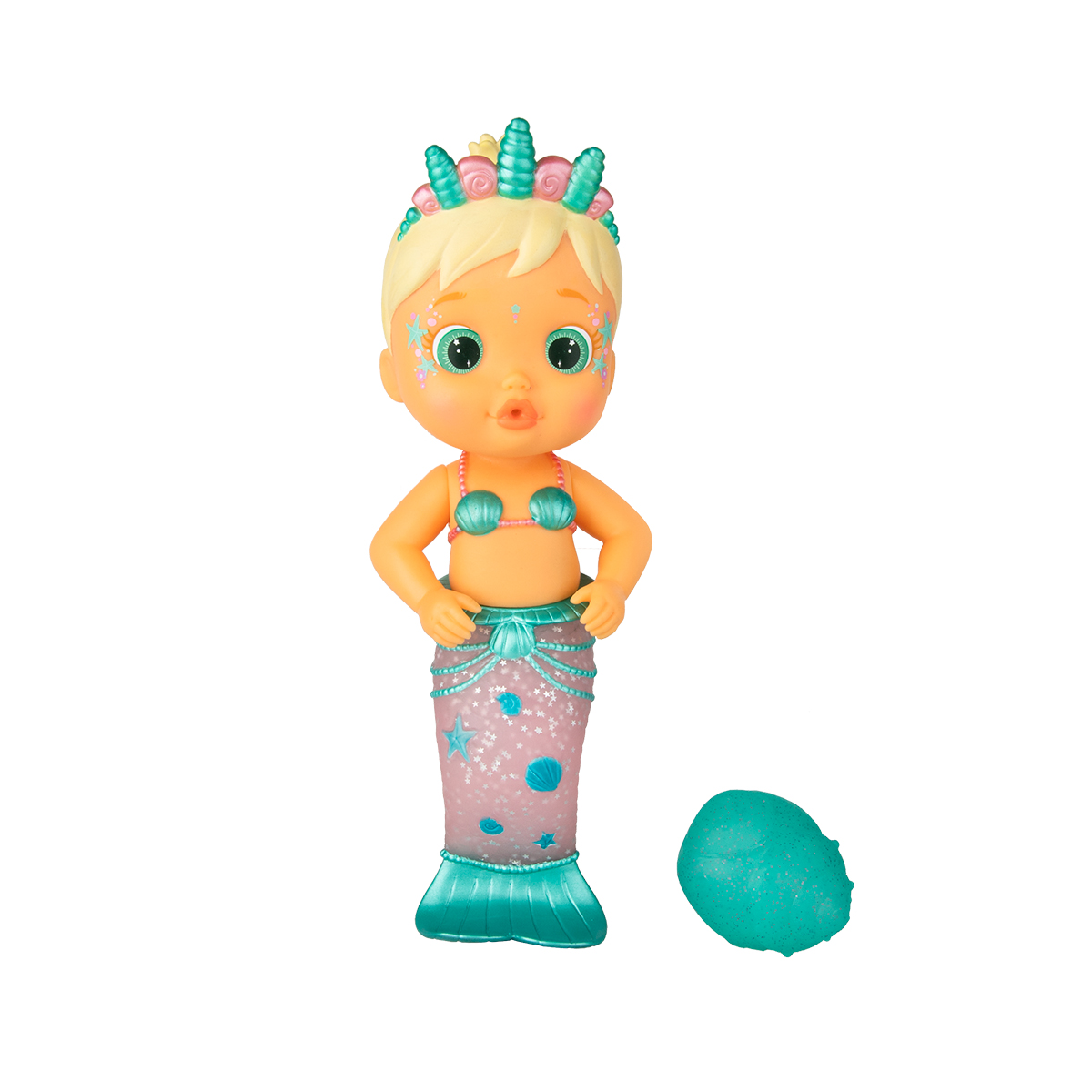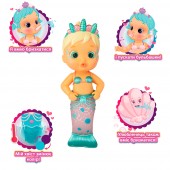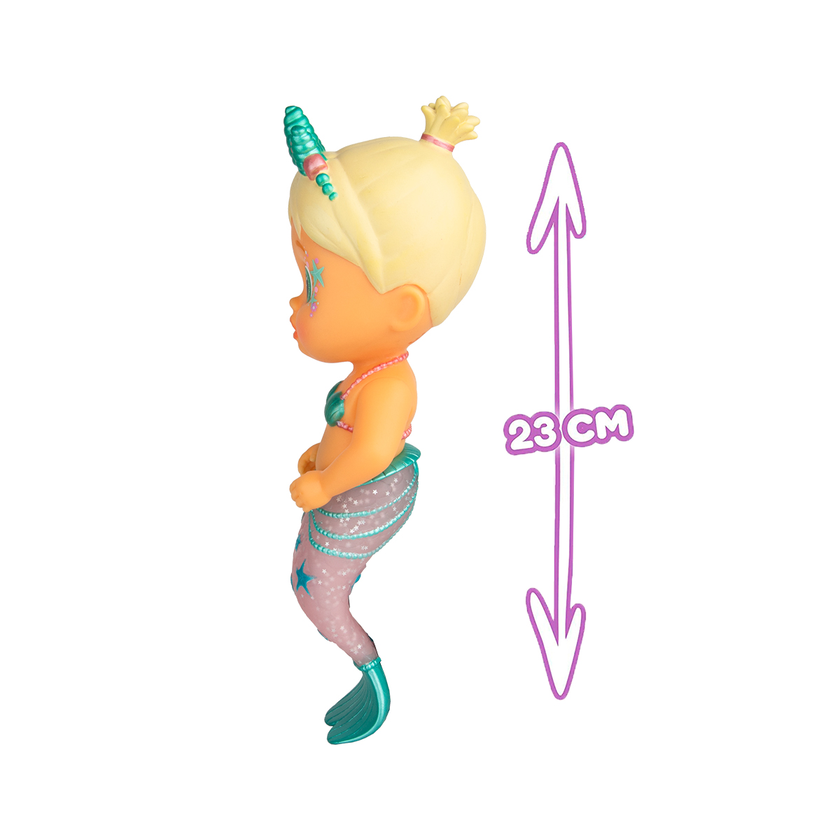 Papusa are o coada frumoasa de sirena cu sclipici si o diadema fermecatoare.