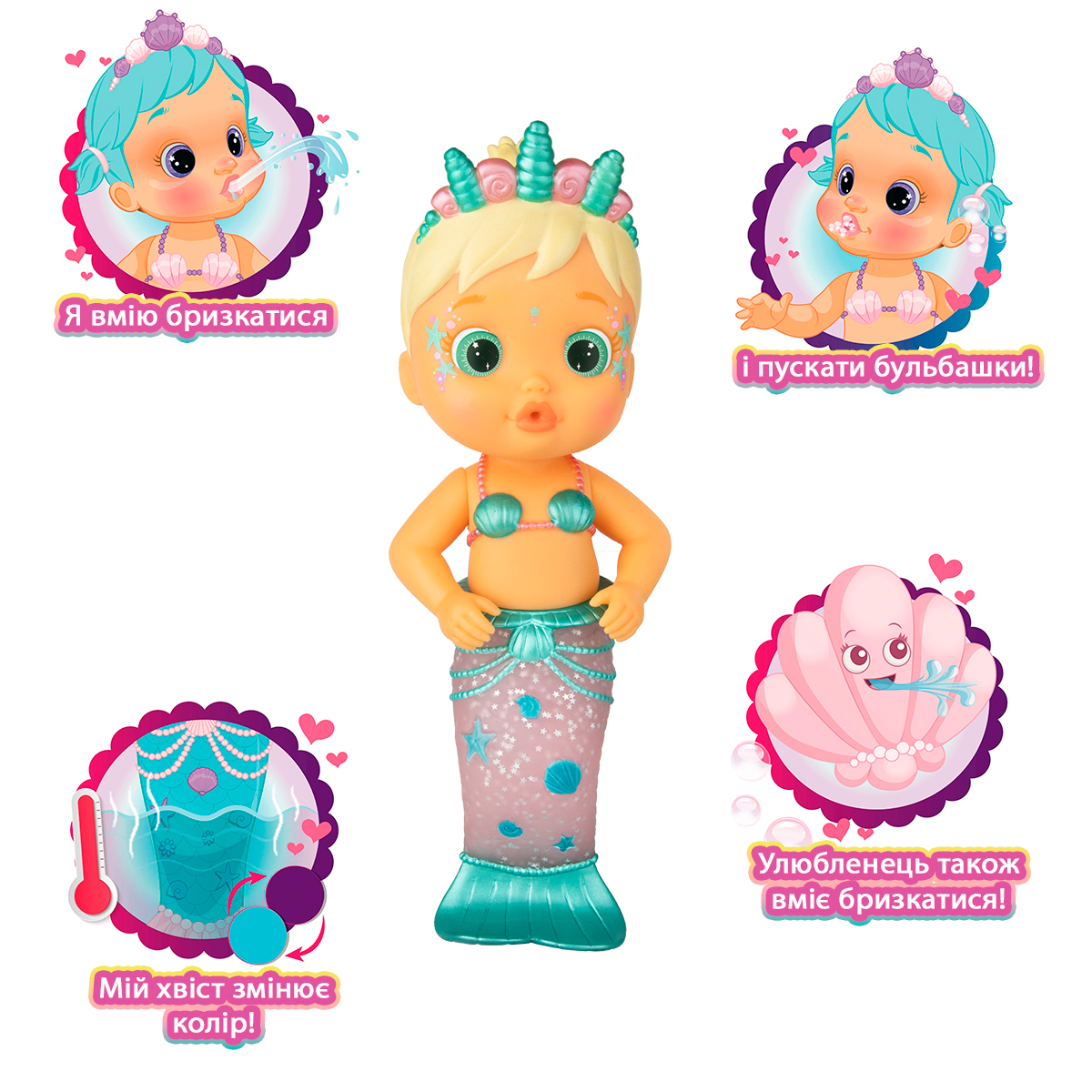 Daca pui papusa in apa calda, unele elemente ale cozii isi vor schimba culoarea! Iar daca ii dai papusei sa bea apa cu sapun, aceasta va stropi sau va sufla cu bule!