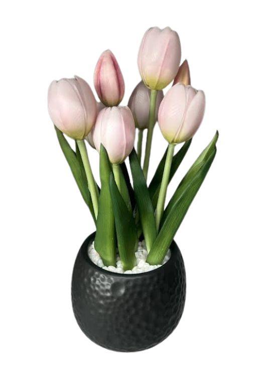 Lalele artificiale in ghiveci 32 cm, roz, model ZJA397012 sunt un aranjament decorativ modern si elegant, ideal pentru decorarea casei, biroului sau spatiilor comerciale. Buchetul contine mai multe lalele roz cu aspect natural si frunze verzi realiste, asezate intr-un ghiveci decorativ negru cu finisaj texturat si pietricele ornamentale albe.