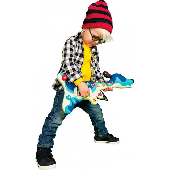 Jucaria are forma unui caine simpatic care canta la chitara, cu detalii colorate si atractive care capteaza atentia. Cand este apasat butonul sau cand jucaria este activata, cainele produce sunete muzicale, imitand o melodie jucausa sau acorduri de chitara.