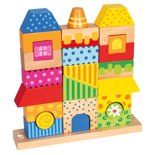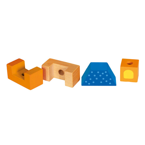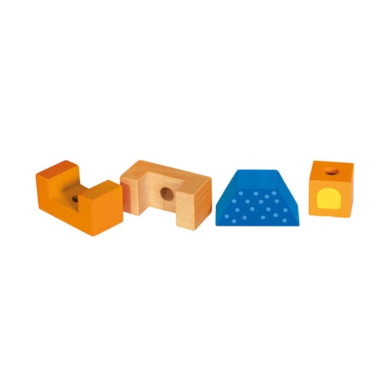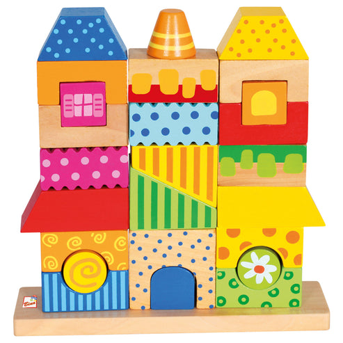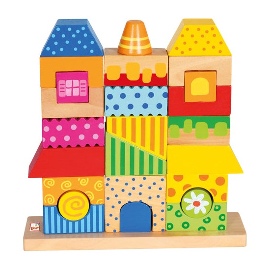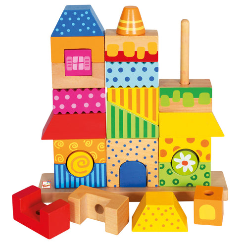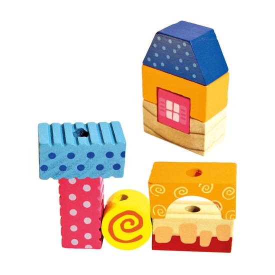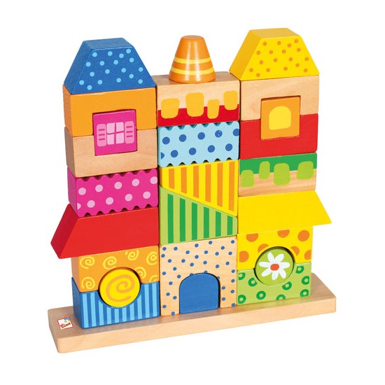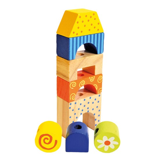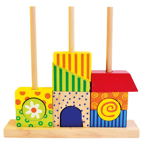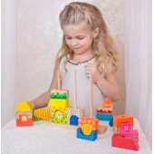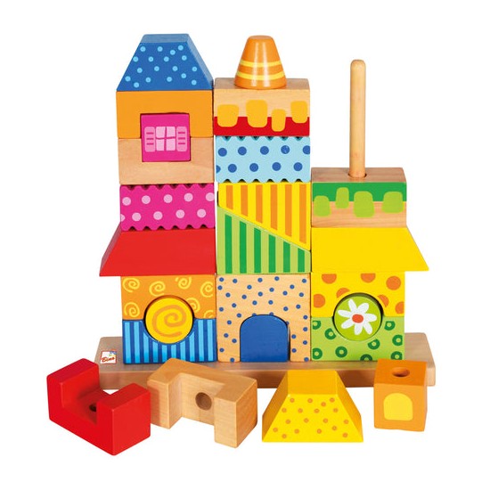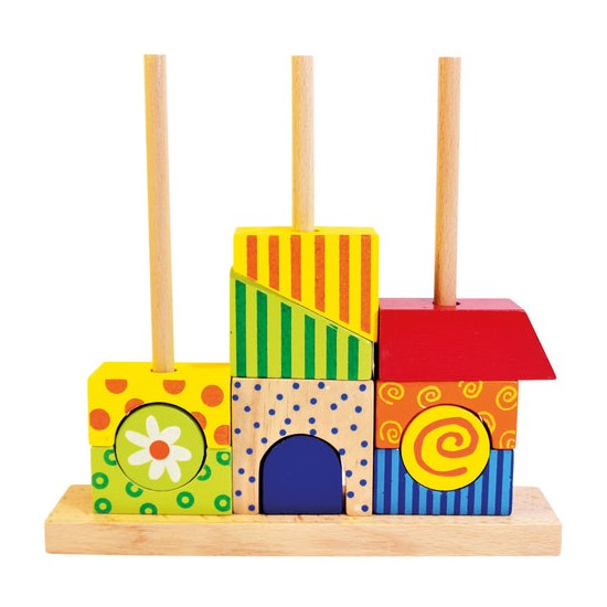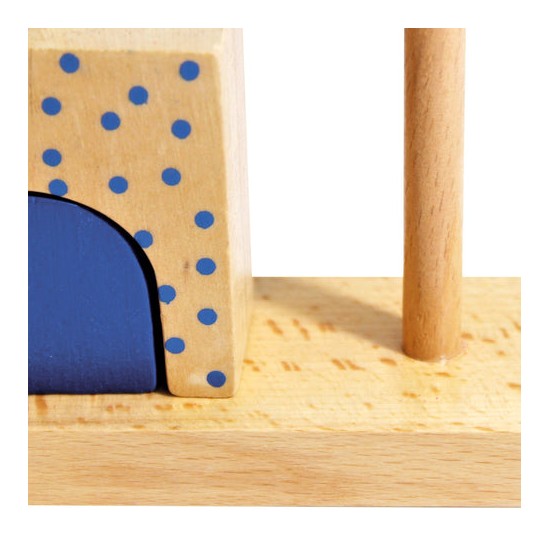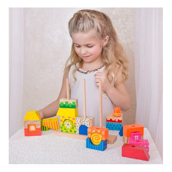 Nu exista jucarii mai practice si durabile decat jucariile din lemn. Cu acest set din lemn, copilul poate construi o varietate de structure fixandu-le pe cele trei coloane, exercitandu-si coordonarea si abilitatile motrice fine sau sa isi creasca imaginatia.