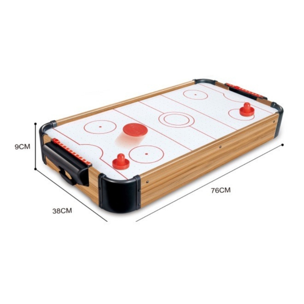 Jocul vine cu un puc din plastic rezistent, special conceput pentru a aluneca usor pe suprafata de joc, imitand miscarile rapide. Masa este dotata cu un sistem de scor manual pe ambele parti, ceea ce permite jucatorilor sa tina evidenta punctelor intr-un mod simplu si eficient.