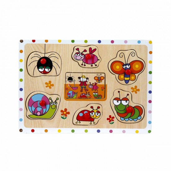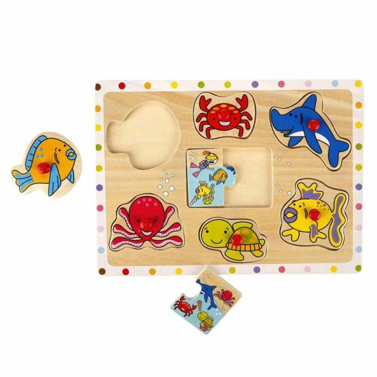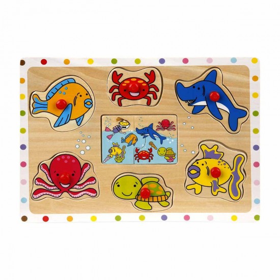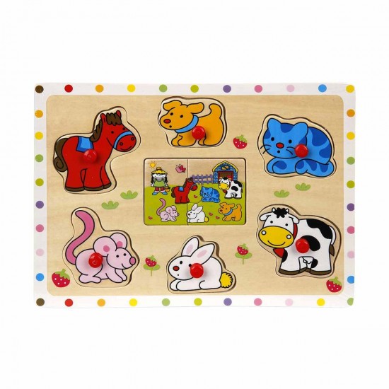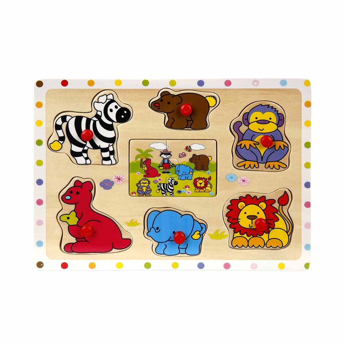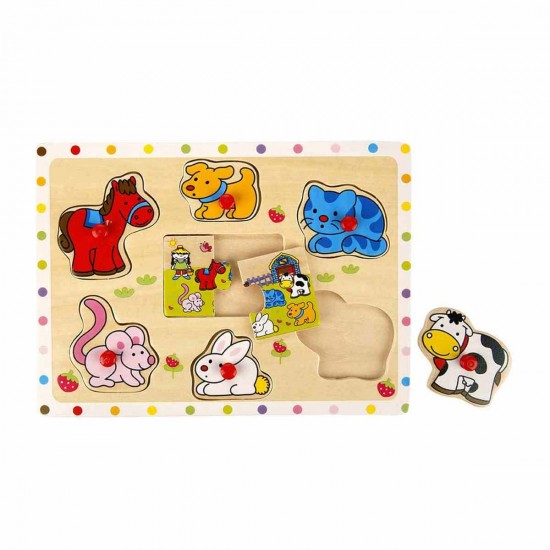 Puzzle din lemn cu buton Animale 22 x 2 x 16,5 cm, diverse tipuri Woody