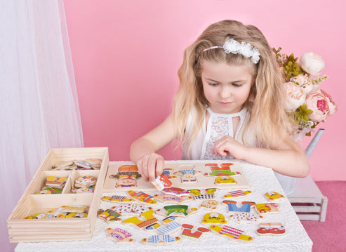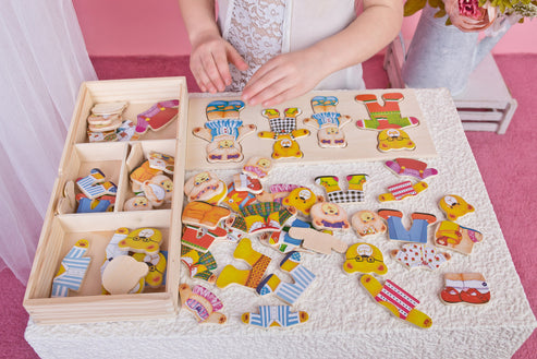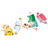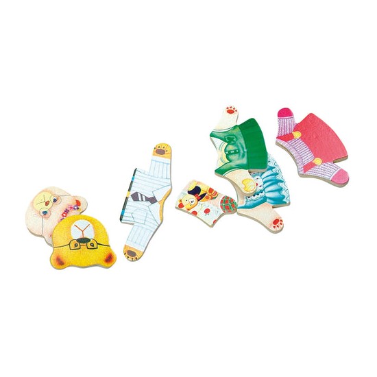 - 72 de piese din lemn care se imbina sub forma de puzzle ce reprezinta imbracamintea si capete de ursuleti;