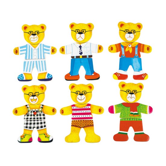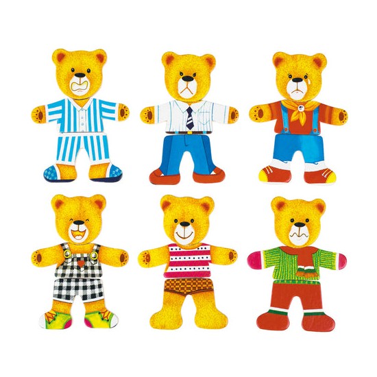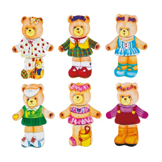 Capacul cutiutei are decupaje pentru cei 4 ursuleti: mama, tata, fratele, sora, iar copilul trebuie sa protriveasca hainutele dupa cum doreste.