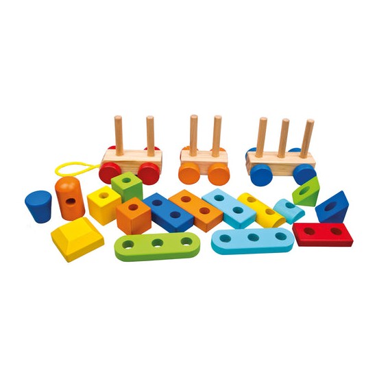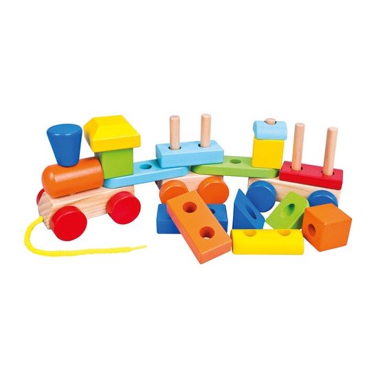 Tren din lemn cu sfoara si doua vagoane, 19 piese, 34x 11 x 7 cm